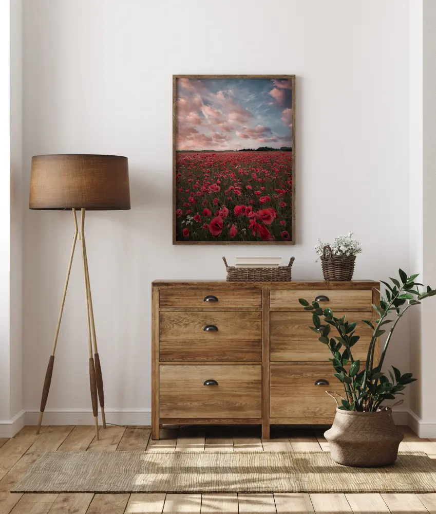 Upea punainen kuva unikkopellosta. Pilvinen punainen taivas korostaa kauniita punaisia unikoita ja valkoisia päivänkakkaroita, jotka kasvavat villisti avoimella pellolla. Lempeä tuuli pyyhkäisee taivaan yli puhaltaen unikon lehtiä. Aivan upea kuva ripustettavaksi kotiisi.