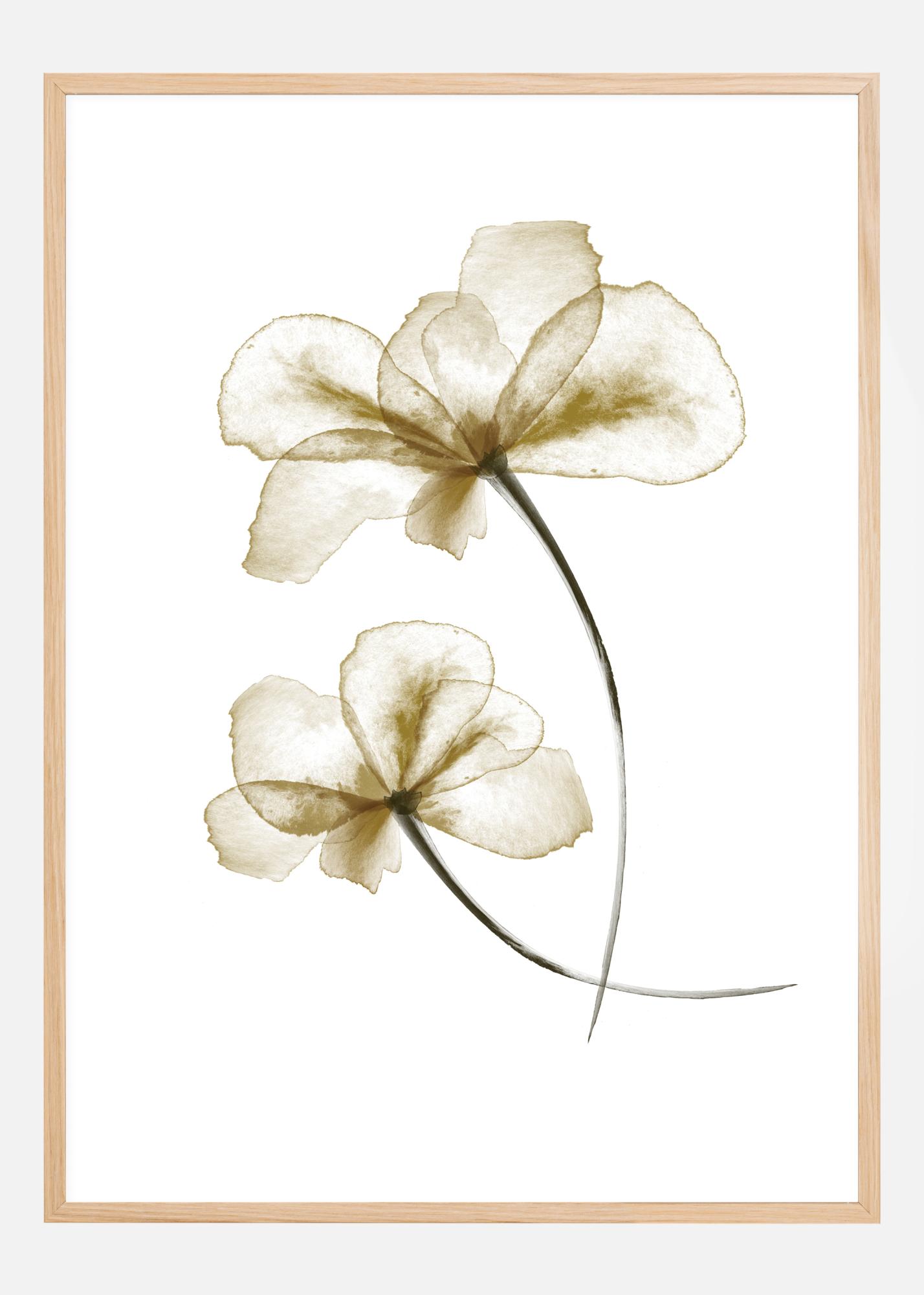 Yksinkertainen, mutta tyylikäs juliste, jossa on kaksi valkoista kukkaa valkoisella taustalla. Julisteen alaosassa kukkien varret ovat kauniisti päällekkäin, mikä luo julisteeseen hienovaraisen ilmeen. Pehmeän ruskean ja beigen sävyjen läpinäkyvyys näyttäisi täydelliseltä kermanvärisellä seinällä.