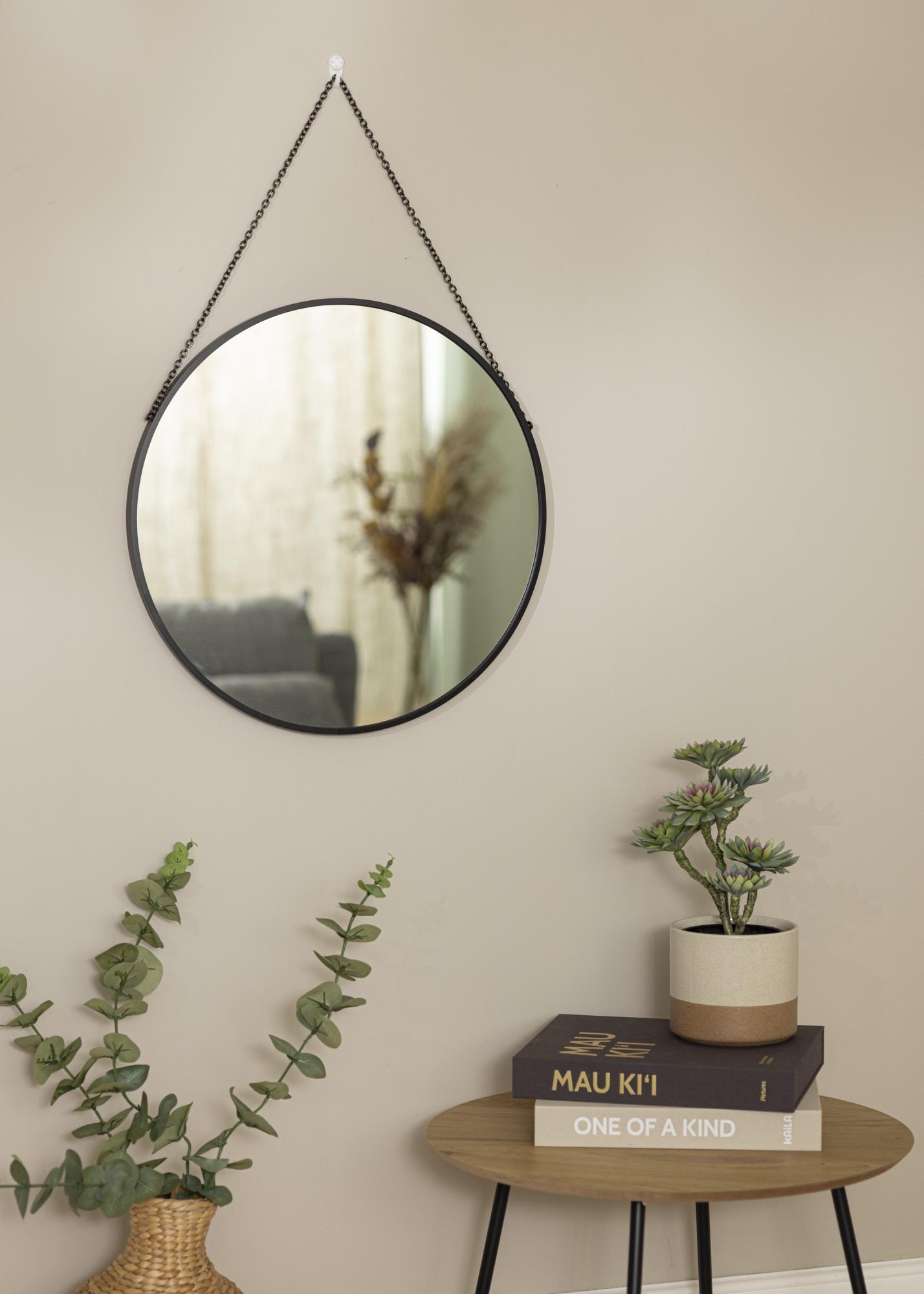 Pyöreä peili on syystäkin klassikko! Peilin pehmeä muoto loihtii eleganssia kotiisi ja erottuu sisustuksen suorista linjoista. Tässä mallissa on 28 mm syvä kehys ja tyylikäs musta sävy, joka on helppo yhdistää muihin sisustusyksityiskohtiin. Peilin kehys on valmistettu metallista. Peili ripustetaan mustasta ketjusta, joka vielä lisää tyylikkyyttä entisestään.