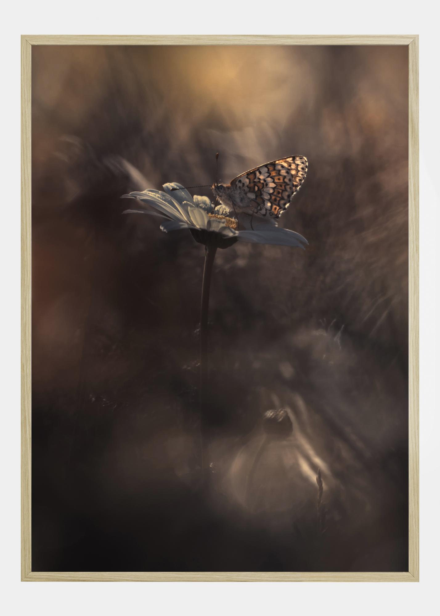Virheetön lähikuva oranssin värisestä perhosesta, joka on yksivartisen päivänkakkaran päällä. Pehmeällä pastellinvärisellä taustalla olevat hämärtyneet värit korostavat päivänkakkaran ja perhosen kauneutta ja herkkyyttä. Henkeäsalpaava kuva takan yläpuolelle ripustettavaksi.