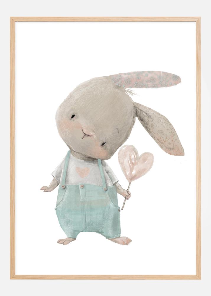 Tämä ihastuttava juliste esittää pientä kania, joka pitää sydämenmuotoista ilmapalloa kädessään, hienostuneesti ja tunteella esitetty akvarellimaalauksen avulla. Kaniinin lempeä, uneksiva katse ja sen vaatteiden hieno yksityiskohtaisuus, johon kuuluu pastellisävyiset kukkakuviot, luovat viattomuuden ja puhtauden tunteen. Tämä kuva on hurmaava kunnianosoitus rakkaudelle ja huolenpidolle, jota sydämenmuotoinen ilmapallo ilmentää.