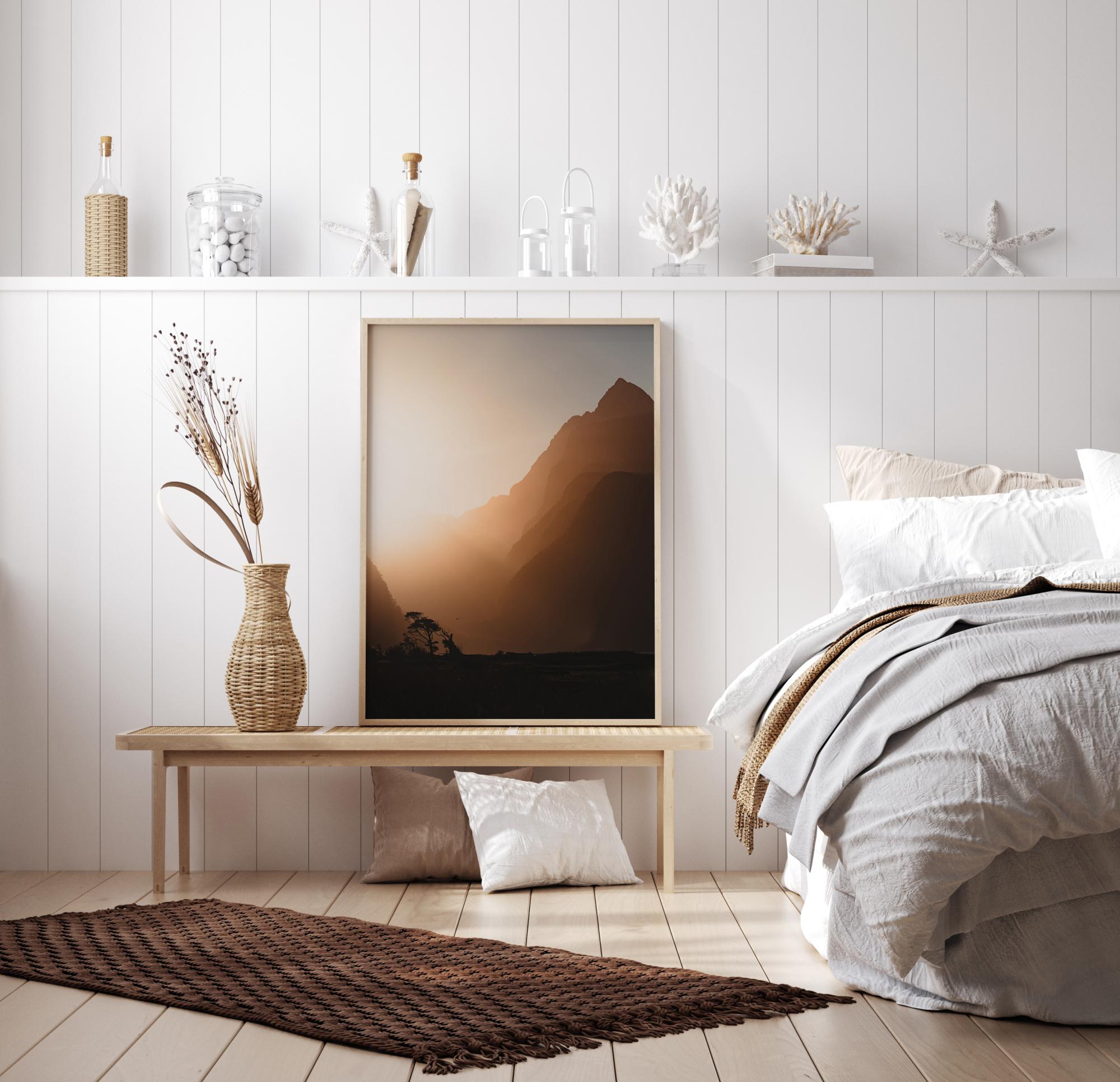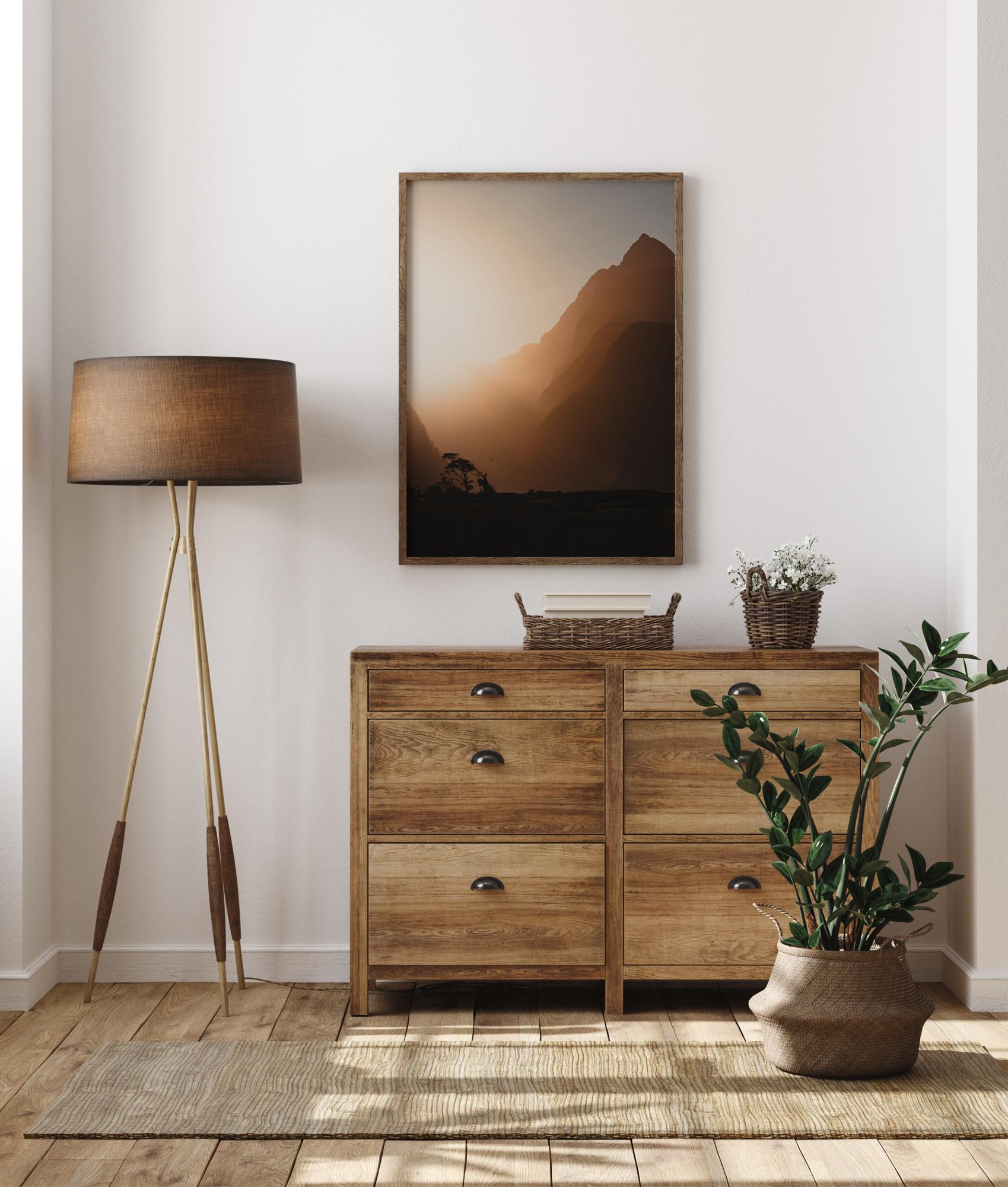 Kaunis maisemajuliste auringonlaskun aikaan. Kukkuloiden välissä oleva aukko loistaa kirkkaina sokaisevina säteinä luoden tumman etualan. Kaukana olevat puut ja lintu osoittavat elämän olemassaoloa. Koristele makuuhuoneesi tällä eloisalla julisteella.