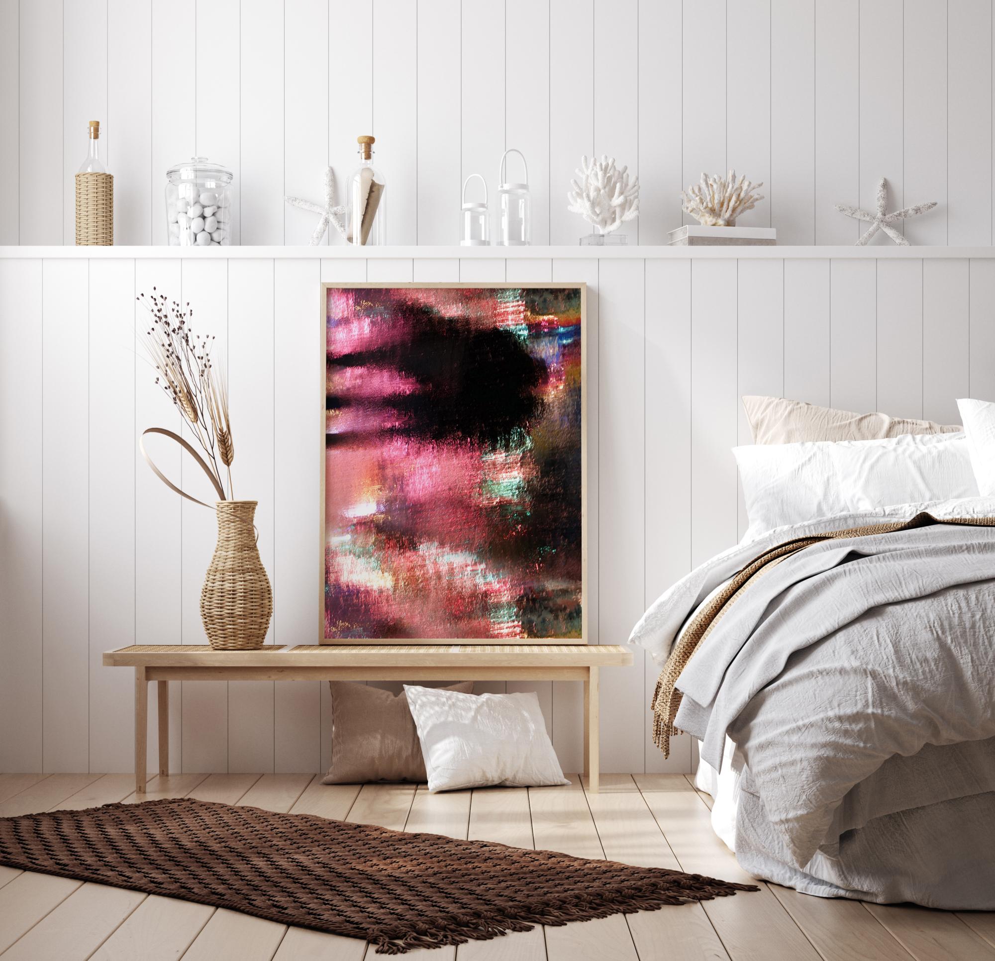 Täydellinen värisekoitus, jossa vaaleanpunaiset sävyt hallitsevat tätä moniväristä kuvaa. Kuvan yläreunassa musta alue luo syvyyden tunteen. Mustan alueen oikealla puolella on pystysuora putki, joka on punaisen ja vihreän värinen. Täydellinen kuva, joka tuo värikkyyttä tavalliseen seinään.