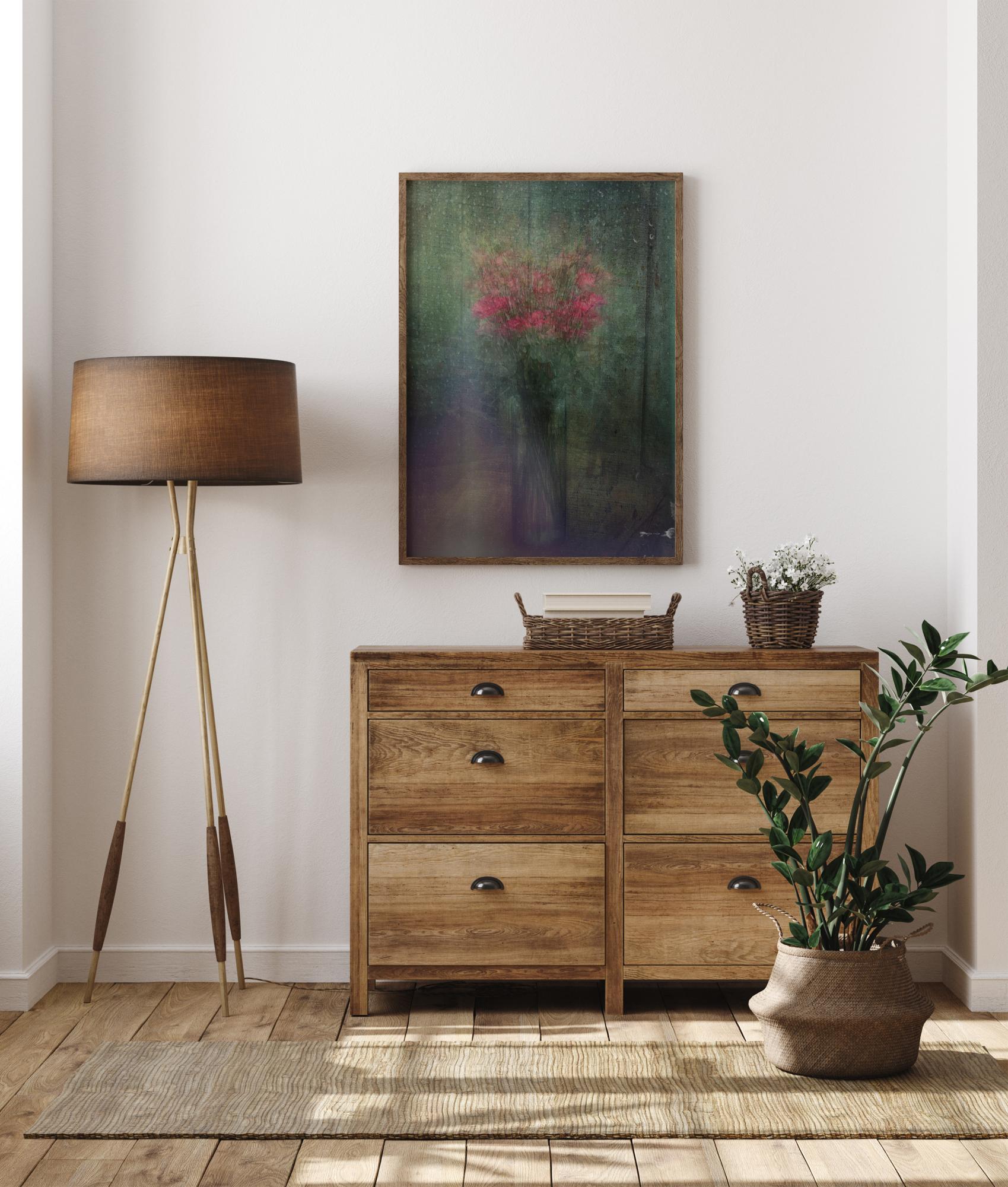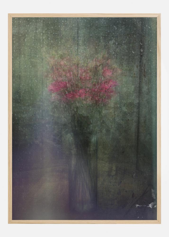 Upea juliste vaaleanpunaisesta kukkakimpusta sadepäivänä. Vihreälle taustalle asetettu läpinäkyvä kukkamaljakko seisoo vaalean violetin värisellä pinnalla. Luonnonvalo säteilee kukkavarsien päälle. Ideapainatus olohuoneen seinälle.