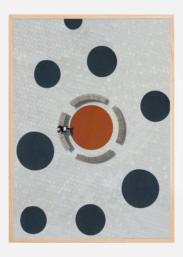 Tämä konseptuaalinen juliste vangitsee ainutlaatuisen, lintuperspektiivikuvan lukevasta henkilöstä, jota ympäröi symmetrinen ja graafinen kompositio. Valkoisen laatoitetun pinnan abstrakti muotoilu, jota rikkovat suuret mustat ympyrät ja keskellä oleva ruosteenpunainen ympyrä penkkeineen, luo vahvan visuaalisen kontrastin. Tämä juliste ei ole vain kunnianosoitus suunnittelulle ja arkkitehtuurille, vaan myös leikkisä tulkinta arkisista kohtauksista.