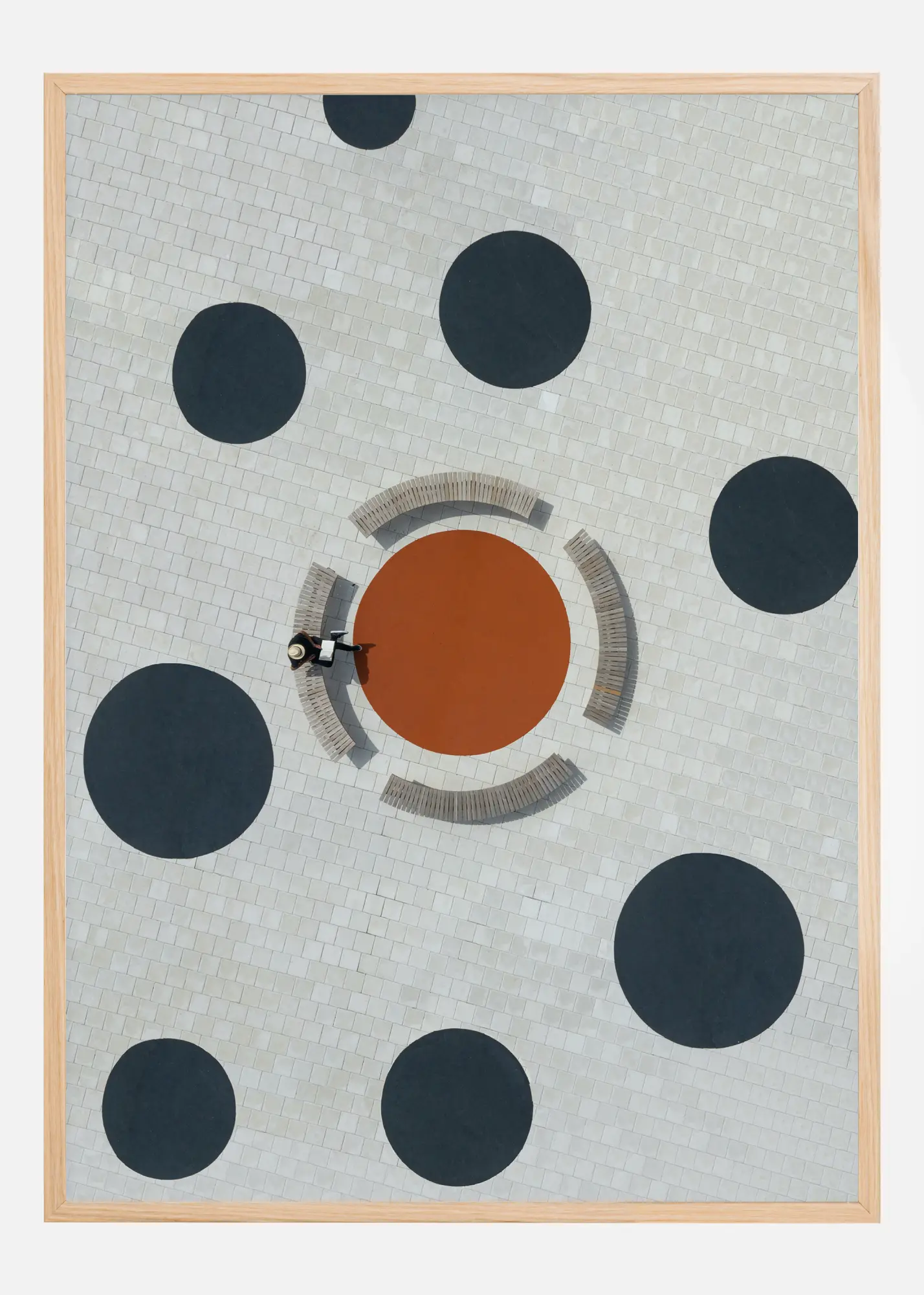 Tämä konseptuaalinen juliste vangitsee erottuvan, lintuperspektiivikuvan lukijasta, jota ympäröi symmetrinen ja graafinen sommitelma. Valkoisen laatoitetun pinnan abstrakti muotoilu, jonka katkaisevat suuret mustat ympyrät ja keskeinen ruosteenpunainen ympyrä penkkeineen, luo voimakkaan visuaalisen kontrastin. Tämä juliste ei ole ainoastaan kunnianosoitus muotoilulle ja arkkitehtuurille, vaan myös leikkisä tulkinta arkisista kohtauksista.