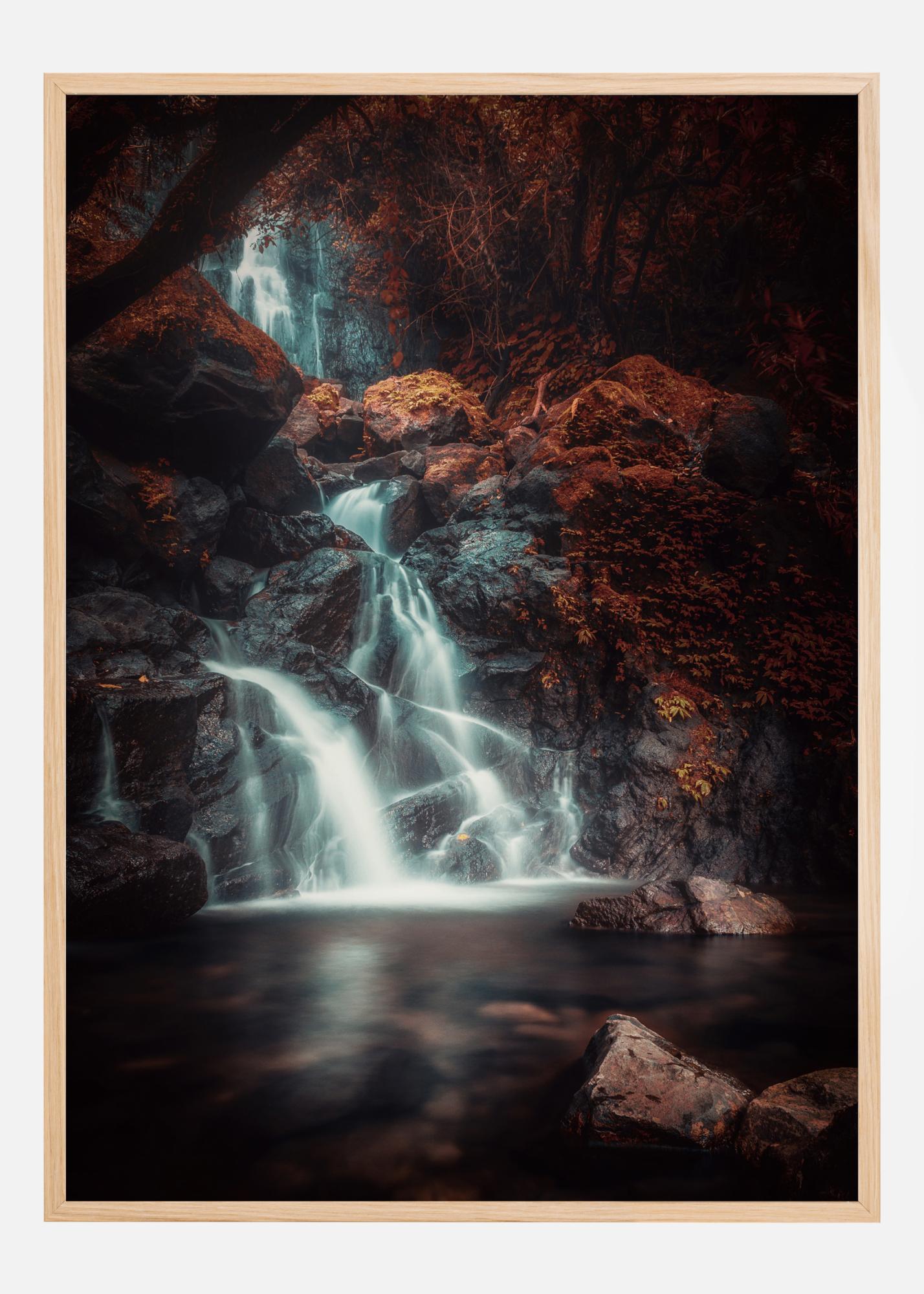 Fantasiajuliste maagisesta vesiputouksesta punaisen sammaleen ja punaisten puiden keskellä. Kuvan tumma luonne auttaa luomaan maagisen tunnelman, jonka keskipisteenä on kirkkaan valkoinen vesiputous. Matkusta omaan Eedenin puutarhaan tässä kuvassa.