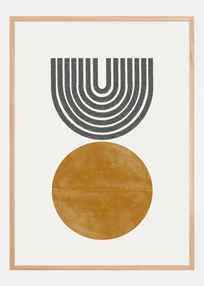 Tämä retrohenkinen juliste yhdistää geometrisen tarkkuuden orgaanisiin kaariin, luoden liikkeen tunnetta ja retrocharmia. Suuri okrankeltainen ympyrämuoto alhaalla antaa vahvan perustan, kun taas mustavalkoiset kaaret yläpuolella muistuttavat ääniaaltoja tai abstraktia maisemaa, luoden mielenkiintoista kontrastia ja syvyyttä.