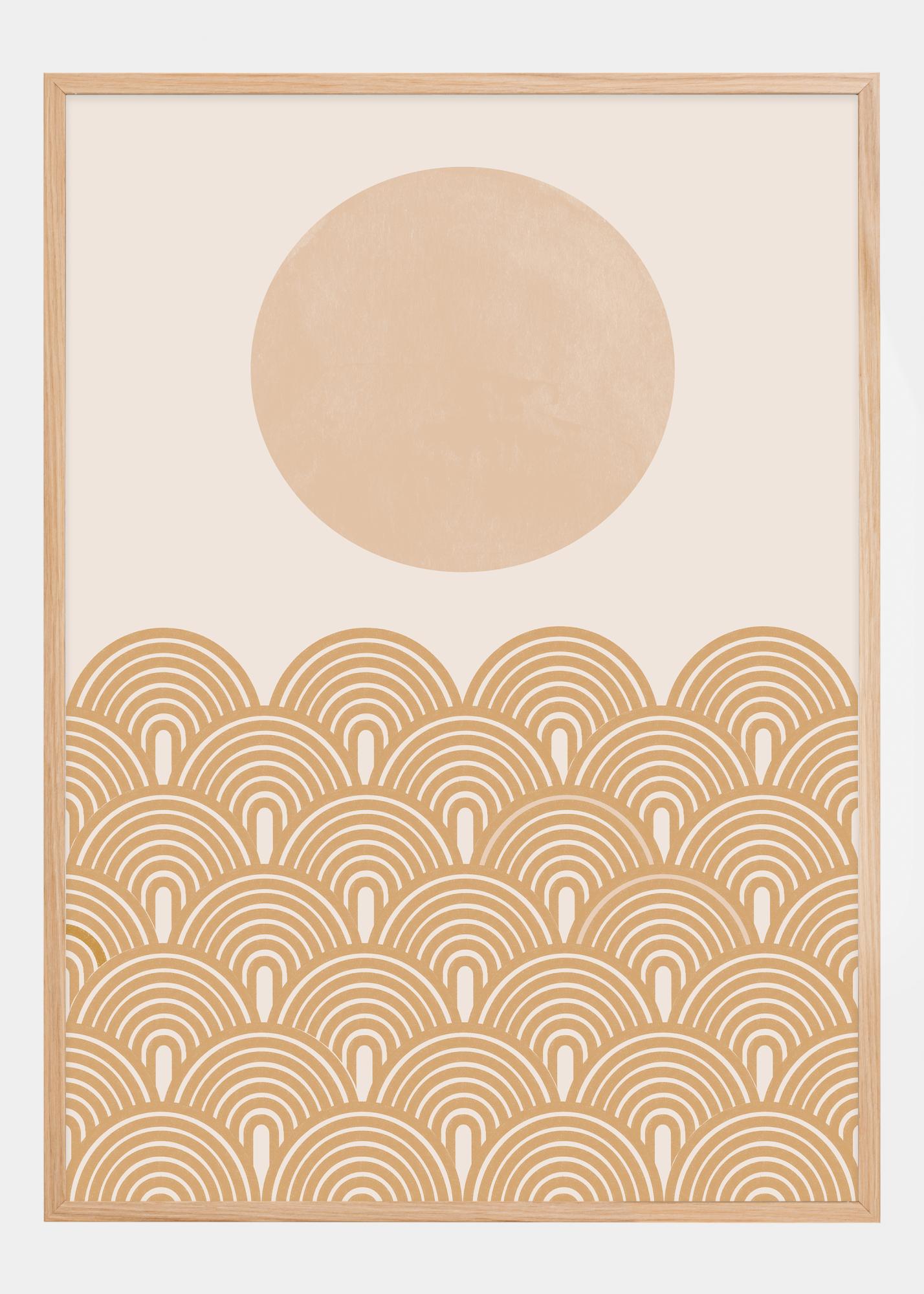 Tämä juliste on aurinkoinen tulkinta retromuodoista ja kesäviboista, jossa suuri vaaleanpunainen ympyrä leijuu lämpimän terrakotan sävyisellä kaarevien elementtien kuvioinnilla. Kaaret ovat yhdistetty tavalla, joka muistuttaa aaltoja tai kukkuloita, antaen liikkeen ja elävyyden tunteen. Pehmeä väritys lisää lämpöä ja rauhaa.