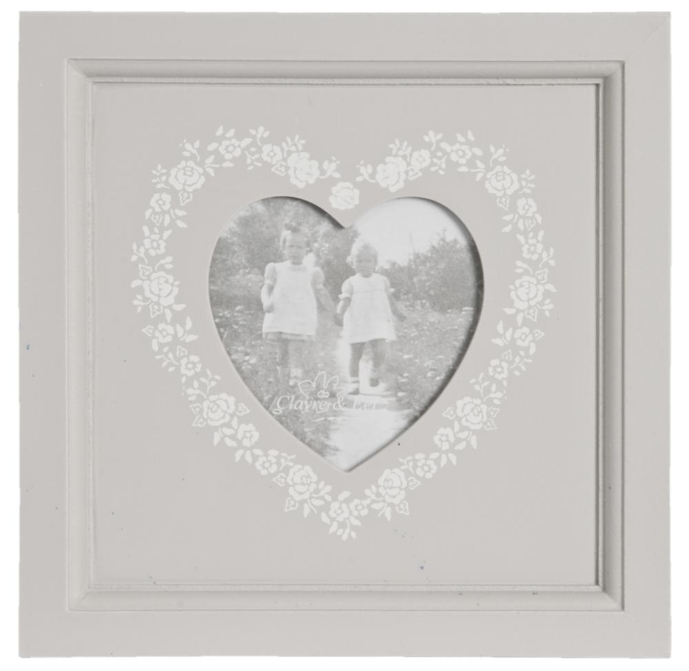 "Retrosydän" on neliönmallinen harmaa valokuvankehys, jossa on paikka 9x9 cm kuvalle. Kuvan aihetta reunustavat retroteemaiset kukkasomisteet.