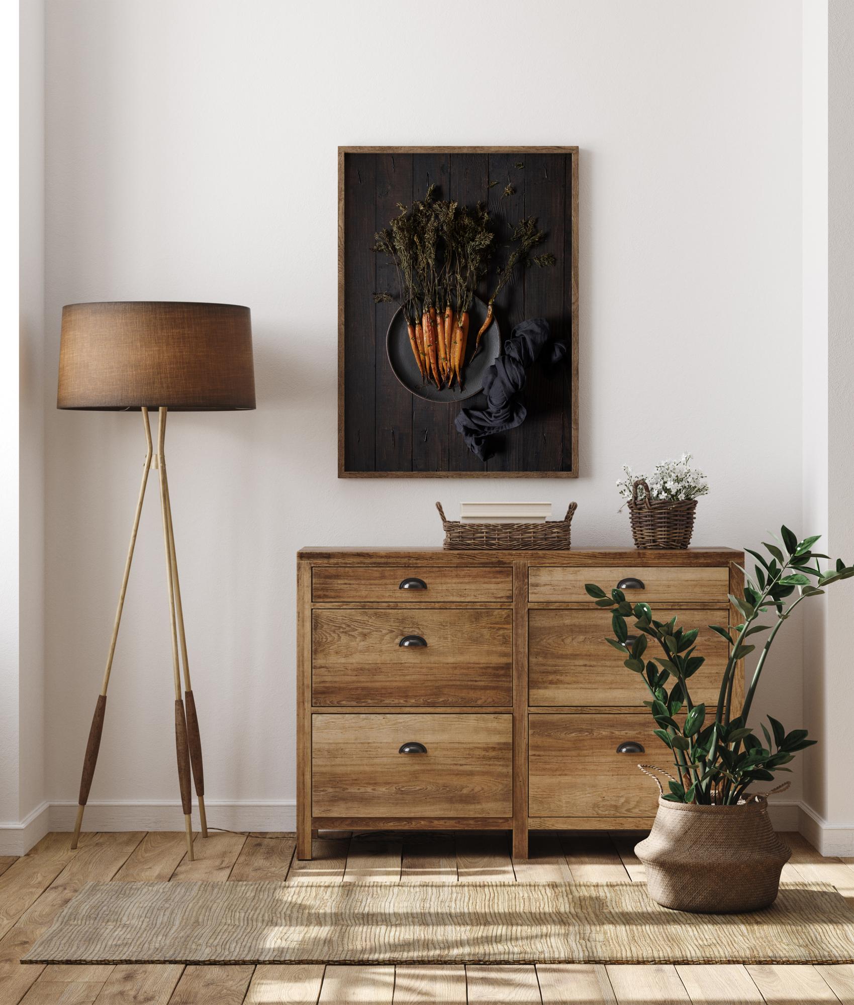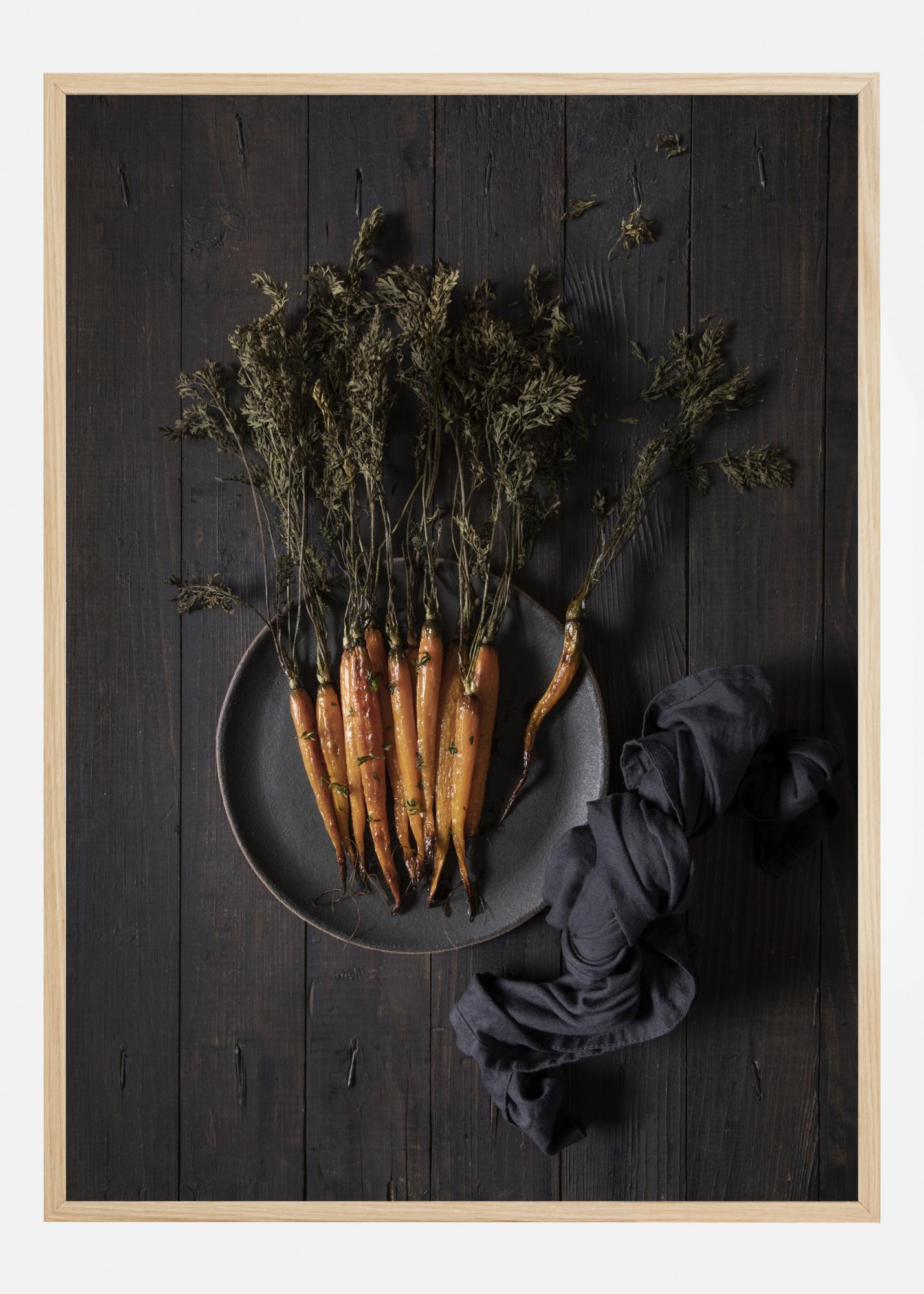 Kulinaristinen juliste, jossa on nippu juuri maasta vedettyjä porkkanoita tummansinisellä lautasella. Oranssit porkkanat suorastaan hehkuvat, kun ne ovat laivastonsinisellä lautasella, jonka takana on tummaa puuta. Kuihtuvat lehdet osoittavat, että nämä porkkanat ovat valmiita syötäväksi. Lisää tämä keittiöösi hauskan foodie-tunnelman luomiseksi.