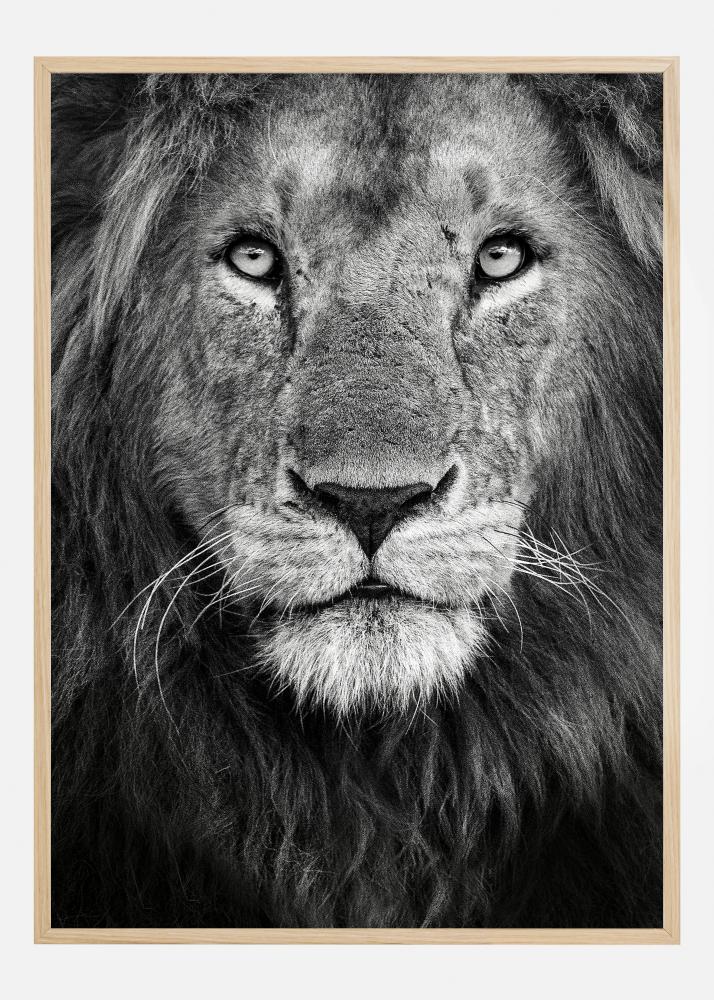 Tämä voimakas ja ilmeikäs juliste esittelee leijonan lähikuvapotretin mustavalkoisena, vangiten eläimen majesteettisen olemuksen ja villin olemuksen. Leijonan intensiivinen katse, sen paksu harja ja jokainen yksittäinen viiksikarva heräävät eloon korkean kontrastin ja valokuvan yksityiskohtaisuuden ansiosta. Tämä on aihe, joka välittömästi kiinnittää katseen ja luo syvän ja pysyvän vaikutelman.