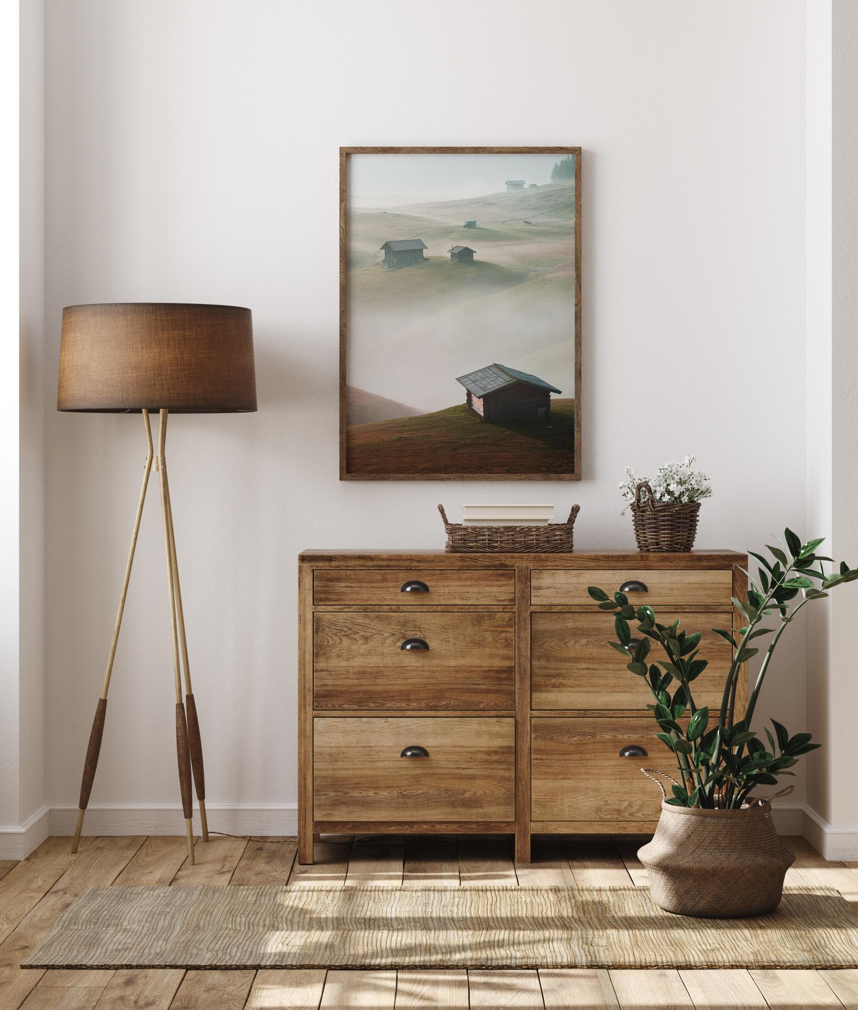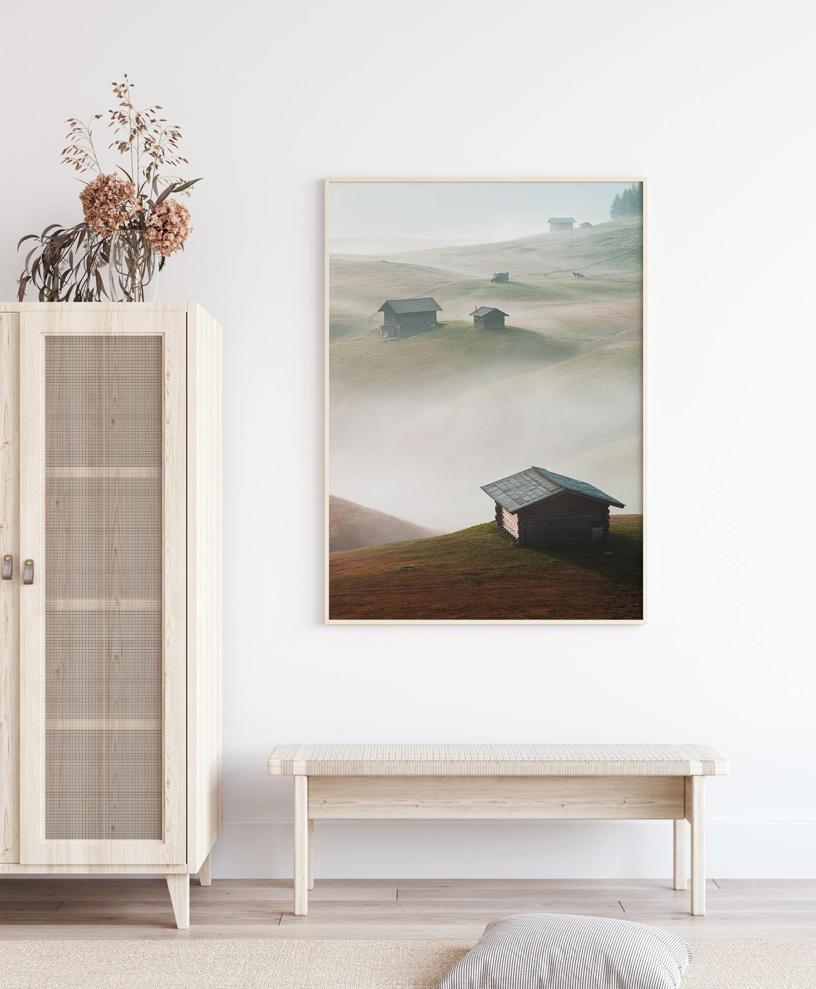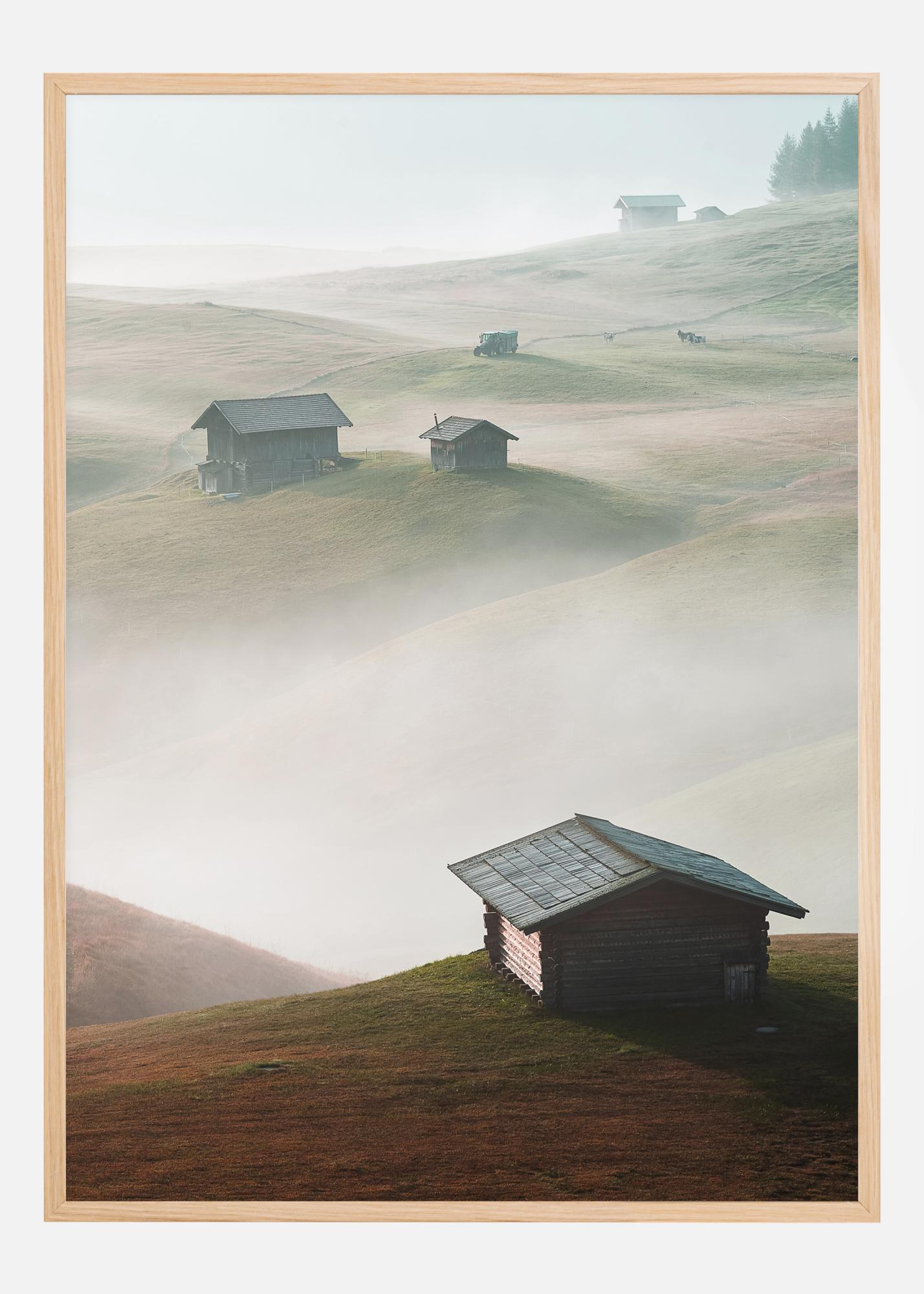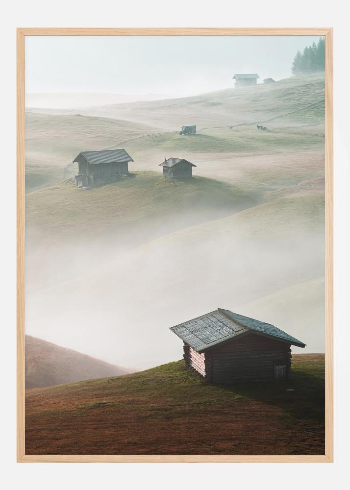 Maaginen juliste taloista, jotka ovat kukkuloilla, ja jotka kohoavat alla olevan sumun ja pilvien yläpuolelle. Jokainen pieni mökki erottuu kumpuilevista vihreistä kukkuloista. Sumu kunkin talon välissä saa talot näyttämään siltä kuin ne olisivat saarilla erillään toisistaan. Rentoudu tässä laajassa näkymässä.
