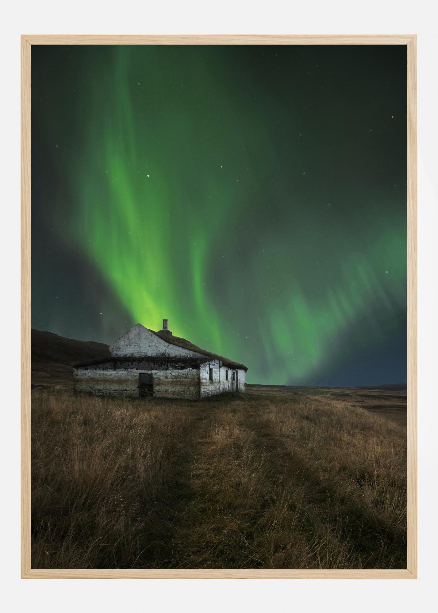 Upea juliste kirkkaanvihreästä ja keltaisesta revontulista pienen valkoisen talon yllä. Revontulien kirkkaat värit näyttävät liikkuvan ja välkkyvän, kun tuijotat tätä lumoavaa näkymää. Nauti luonnon mahtavuudesta ja tuo tämä luonnonilmiö kotiisi eteerisen kauniiksi.
