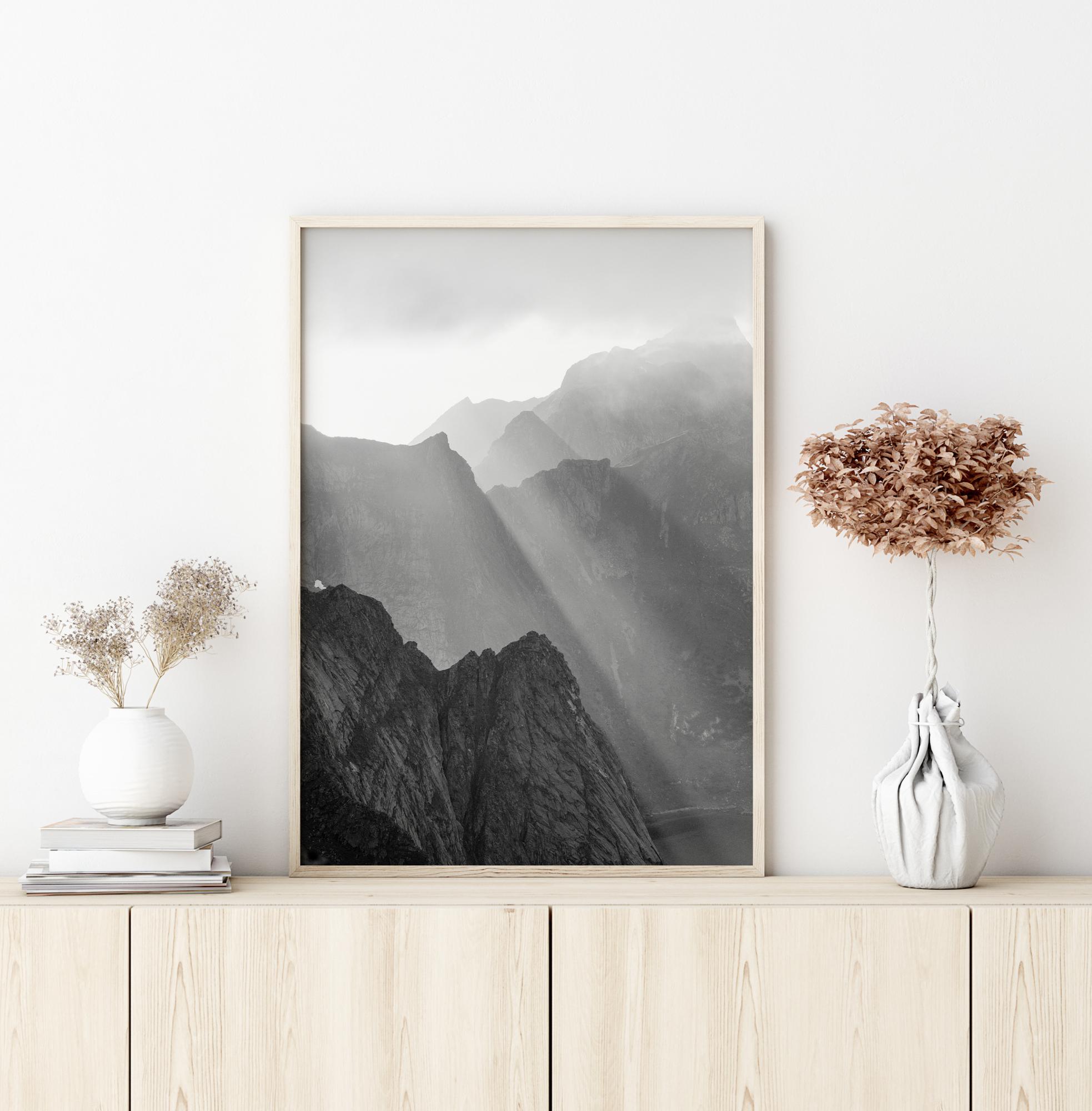 Majesteettinen maisemajuliste, jossa voimakkaan auringonvalon säde paistaa alas vuorten läpi. Vuorenrannan tummat jyrkät muodot kohoavat kirkkaan valkoiseen taivaaseen, josta aurinko paistaa läpi. Lisää tämä upea otos seinällesi dramaattiseksi tunnelmaksi mutta maagiseksi maisemaksi.