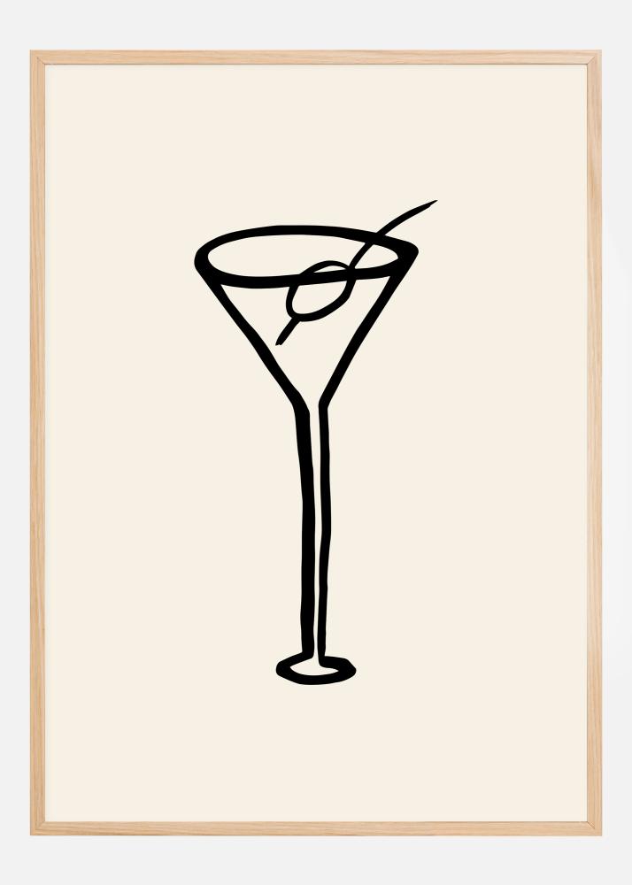 Yksinkertainen juliste cocktaillasista, jossa on oliivi. Saat James Bond -tunnelman, kun ripustat tämän yksinkertaisen mustan viivapiirroksen martinilasista seinällesi. Yhdistä rohkean seinävärin kanssa, jotta tämä vahva piirros tulee esiin. Oletko sinä ravistettu etkä sekoitettu?