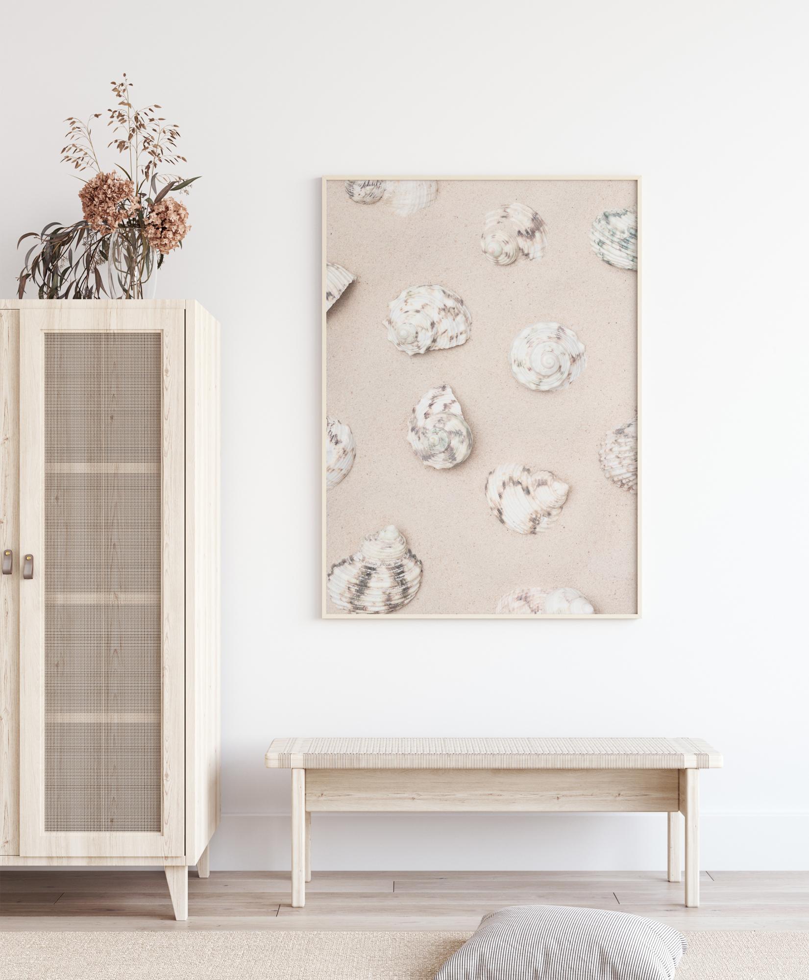 Pastellinvärinen juliste simpukoista vaaleanpunaisella taustalla. Kaksitoista kiemuraista simpukankuorta on eri asennoissa, tasaisin välein koko kuvassa. Jokainen simpukka on valkoisen ja ruskean värinen, mikä tekee kuvasta hyvin pehmeän. Tämä juliste sopii täydellisesti lisäkuvioksi tavalliselle seinälle.