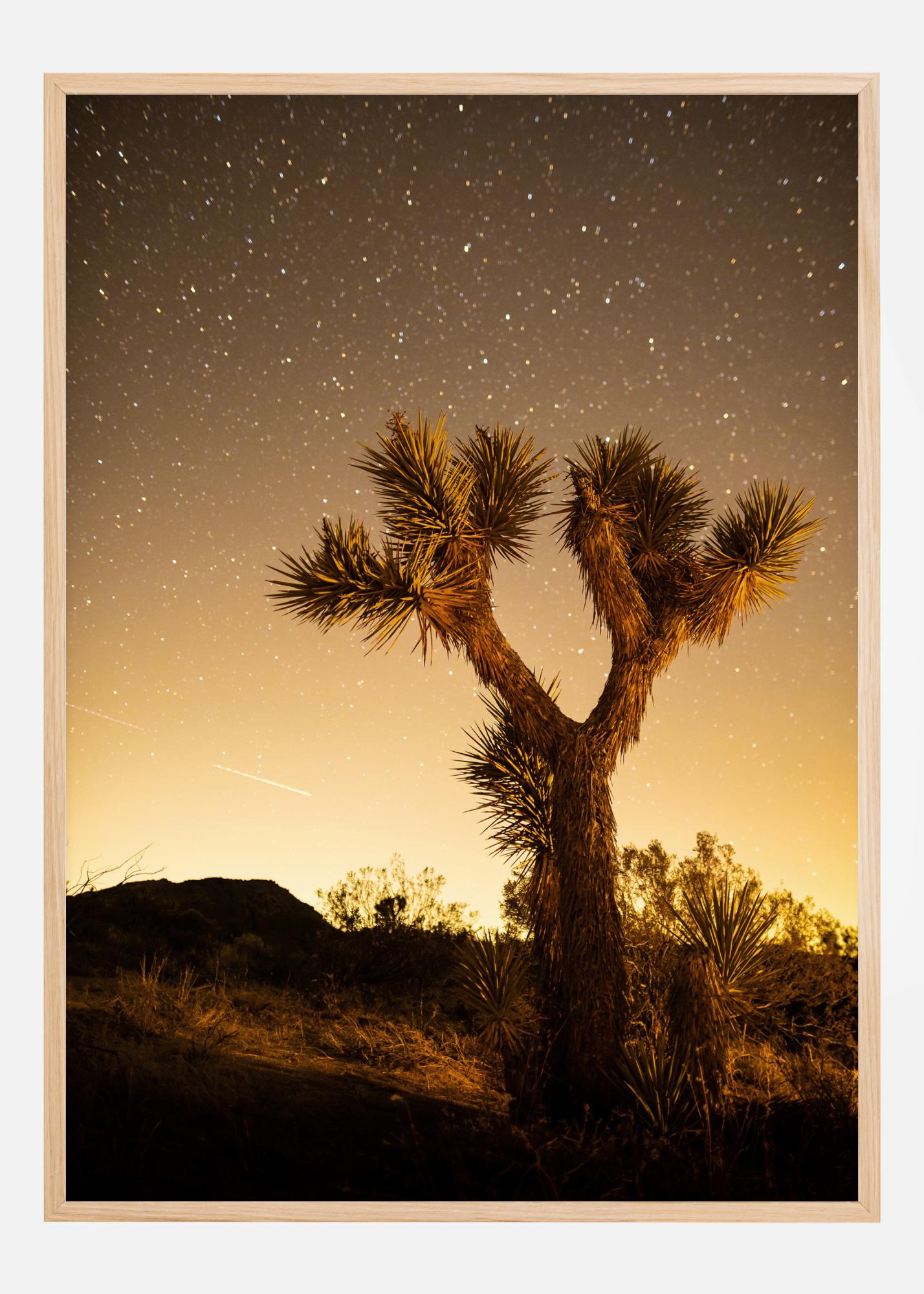 Yöllinen juliste, jossa suuri kaktus seisoo aavikolla ylväänä tähtien täyttämää yötaivasta vasten. Kaktus kylpee pehmeässä kultaisessa hehkussa auringon laskiessa horisonttiin. Tähdet vilkkuvat hellästi pehmeällä lämpimällä taivaalla. Nauti tämän aavikon yötaivaan lämmöstä.