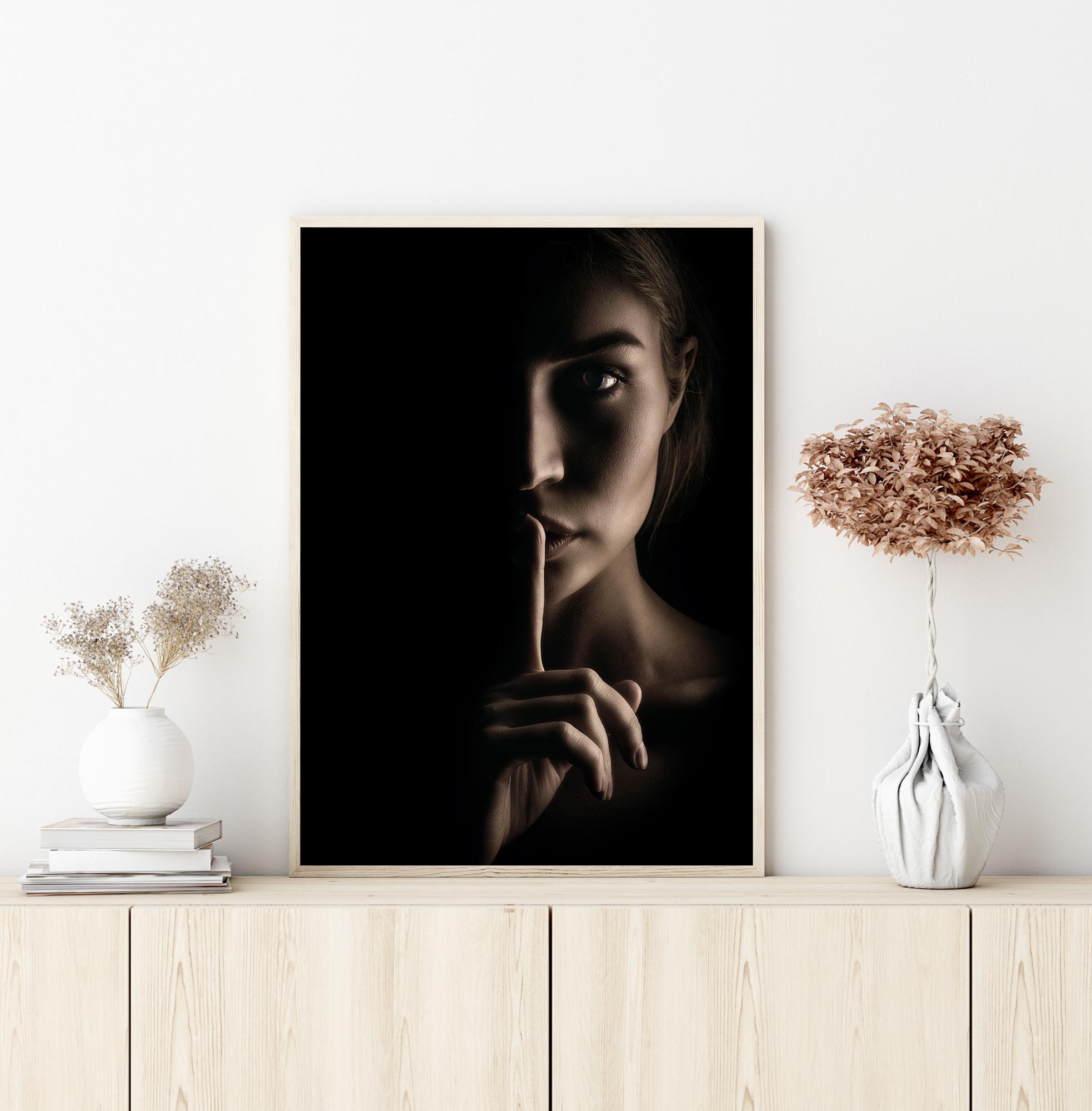 Salaperäinen muotokuvajuliste, jossa naisen kasvot ovat puoliksi varjossa. Yksi sormi on nostettu huulille hiljaisuuden merkiksi, kun hän tuijottaa suoraan silmiisi. Dramaattinen valaistus luo pehmeän hehkun toiselle puolelle ja upottaa hänet varjoon toisella puolella.