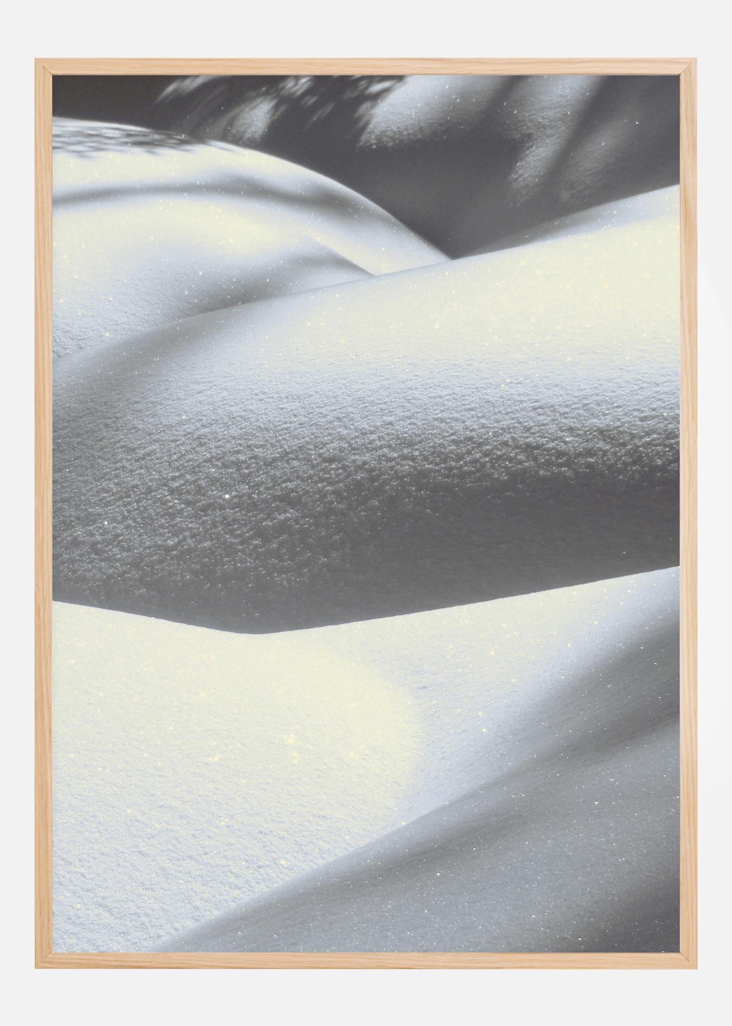 Valkoinen juliste lumesta kumpuavilla kukkuloilla. Tässä kuvassa on valkoisen ja harmaan sävyjä, kun lumi vierii maiseman poikki luoden erilaisia kuvioita ja muotoja. Lumi piilottaa kaiken ja jättää kaiken mielikuvituksen varaan, aivan kuten tämä juliste.