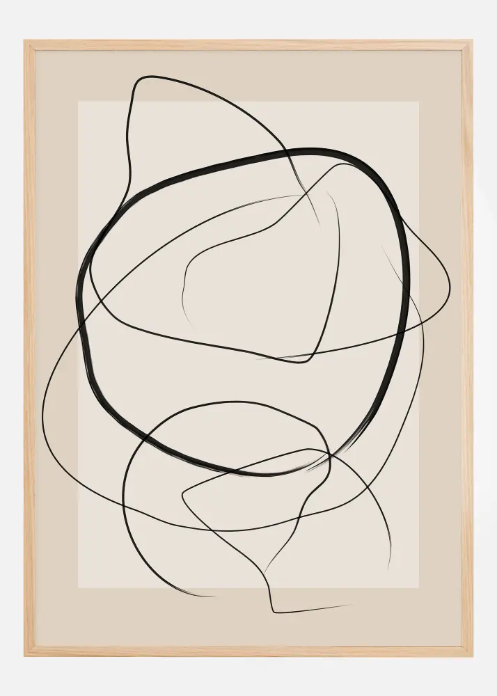 Tämä nykyaikainen juliste on osa taidekokoelmaamme ja esittää sarjan pehmeitä, pyyhkäiseviä viivoja, jotka muodostavat abstraktin ja meditatiivisen sommitelman. Mustat viivat virtaavat vapaasti beigellä taustalla luoden liikkeen ja rytmin tunteen, kutsuen samalla katsojan hetken mietiskelyyn. Tämä minimalistinen mutta rohkea taide on täydellinen niille, jotka arvostavat abstraktin ilmaisun voimaa avata tilaa henkilökohtaiselle tulkinnalle ja sisäiselle pohdinnalle.