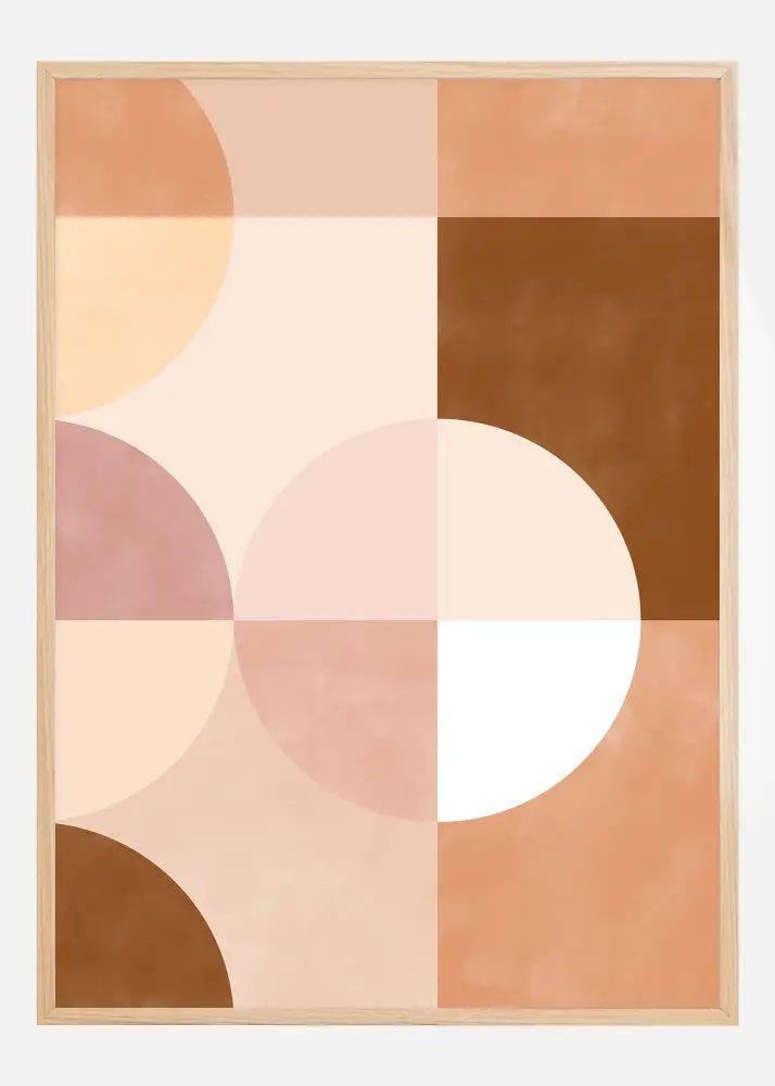 Tämä juliste on tyylikäs kunnianosoitus geometrian ja värien harmonialle. Aihe on hienovarainen mutta silti kiehtova koostumus päällekkäisistä ympyröistä ja neliöistä, jotka on toteutettu pehmeän vaaleanpunaisen sävyjen paletissa, täydentäen tummemmilla terrakotan ja syvän ruskean sävyillä. Tämä muotojen ja värien yhdistelmä luo dynaamisen tasapainon, joka on sekä rauhoittava että visuaalisesti miellyttävä. Täydellinen niille, jotka arvostavat pehmeää ja kutsuvaa esteettisyyttä sisustuksessaan, tämä painokuva on hienostunut lisä, joka voi piristää mitä tahansa huonetta.