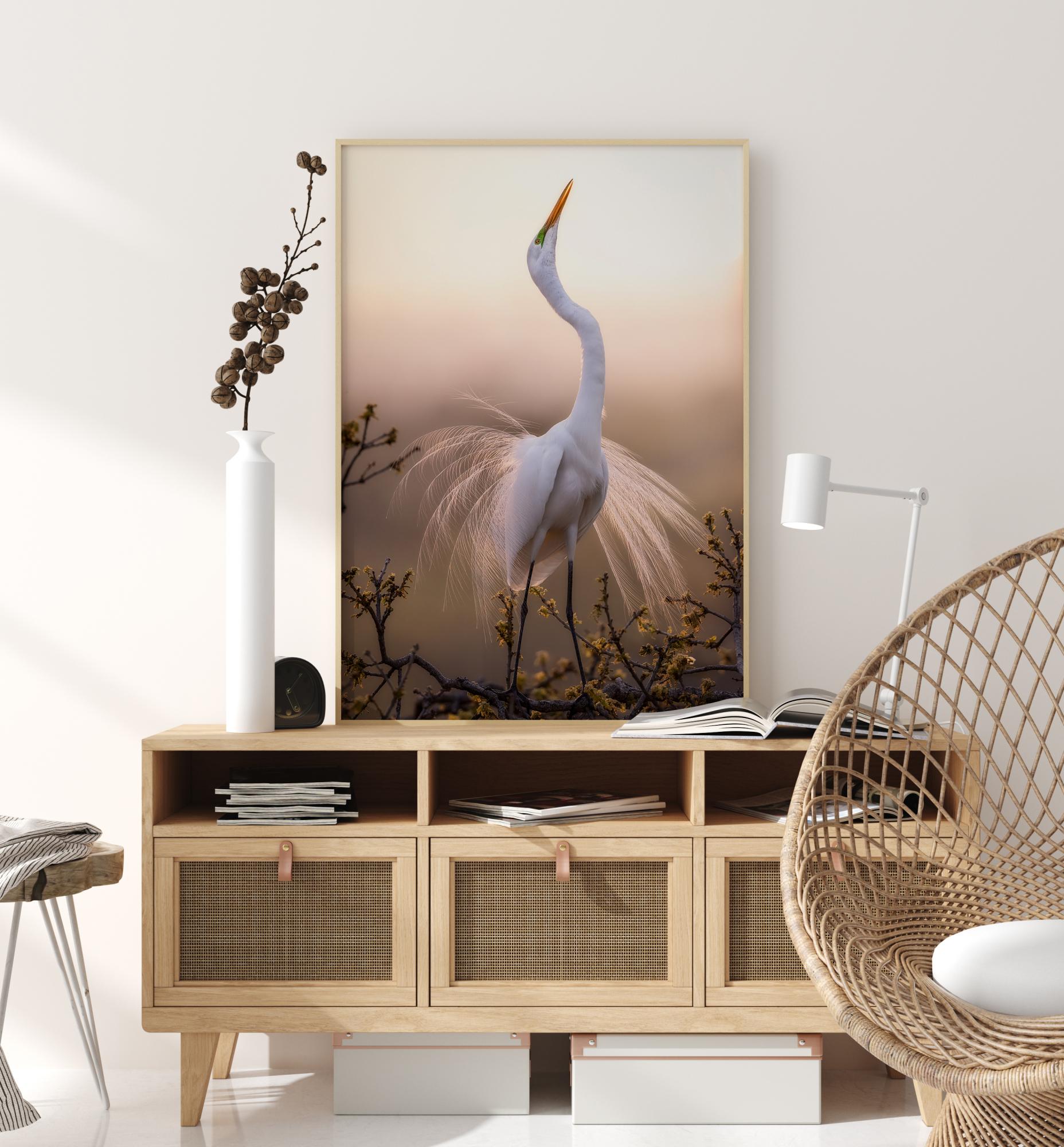 Villieläinjuliste, jossa haikara tanssii aamun valossa. Pitkänä ja valkoisena seisova haikara luo surrealistisen näkymän, kun pehmeä auringonnousu näkyy höyhenten läpi. Herää joka aamu ihmetellen tämän vedoksen avulla.
