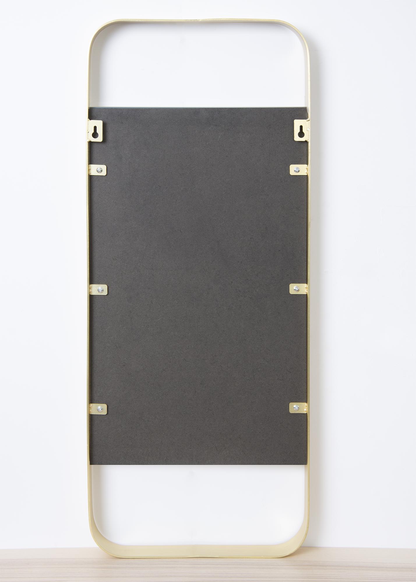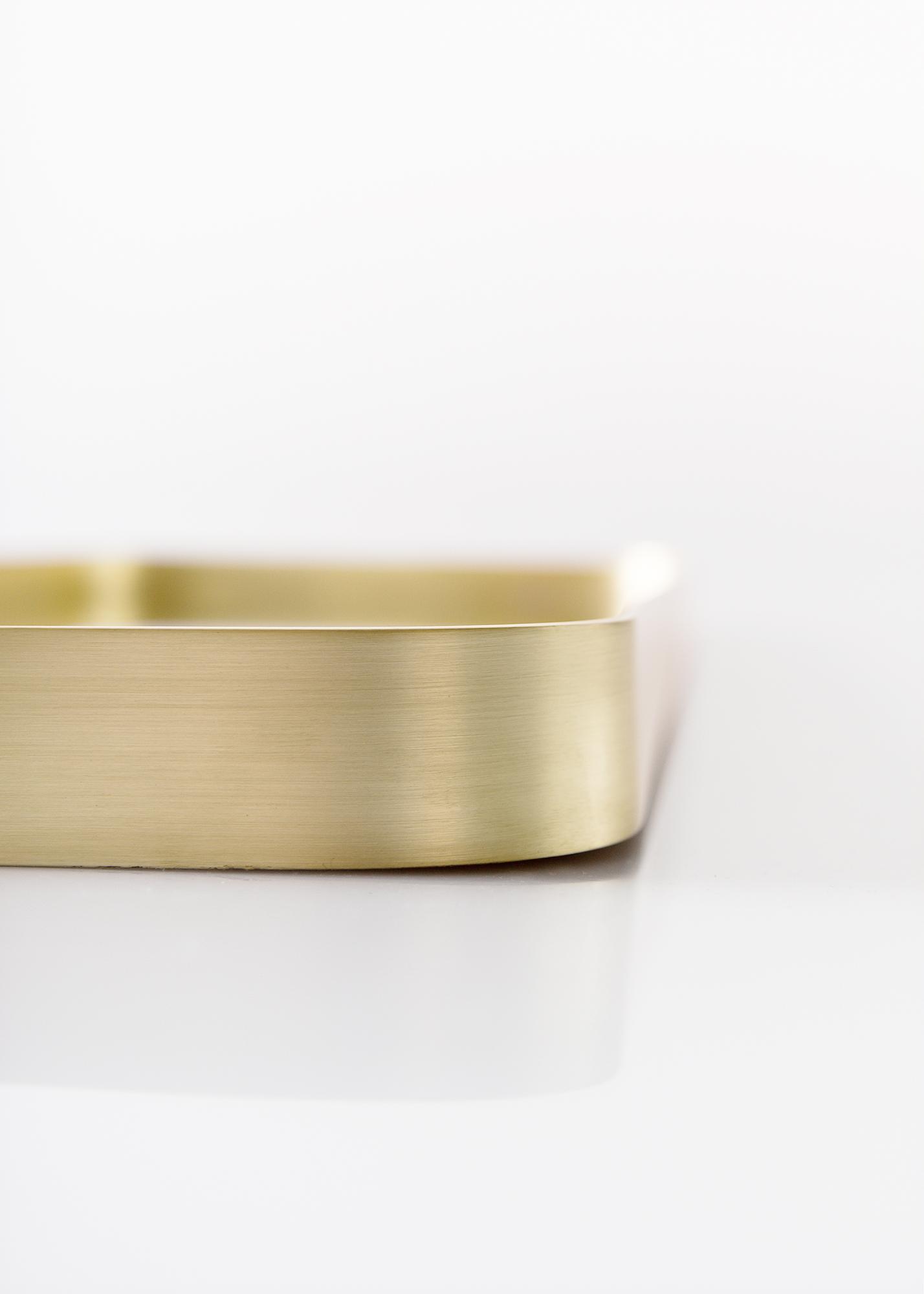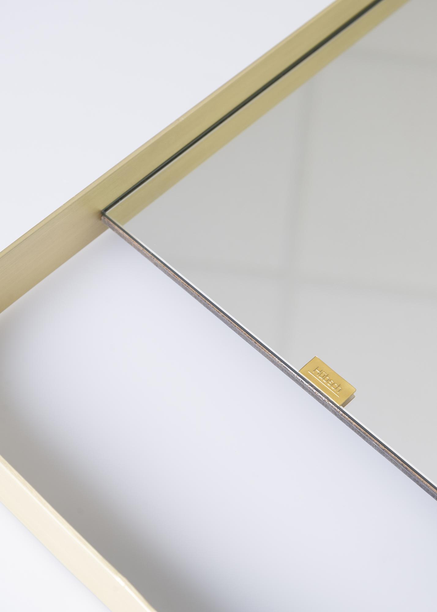 Tyylikäs ja hillitty peili messinginvärisellä kehyksellä. Kehyksellä on koristeelliset pyöristetyt kulmat ja peilillä on kiinnostava muotoilu, koska peililasi ei täytä koko kehystä ylä- ja alaosassa.