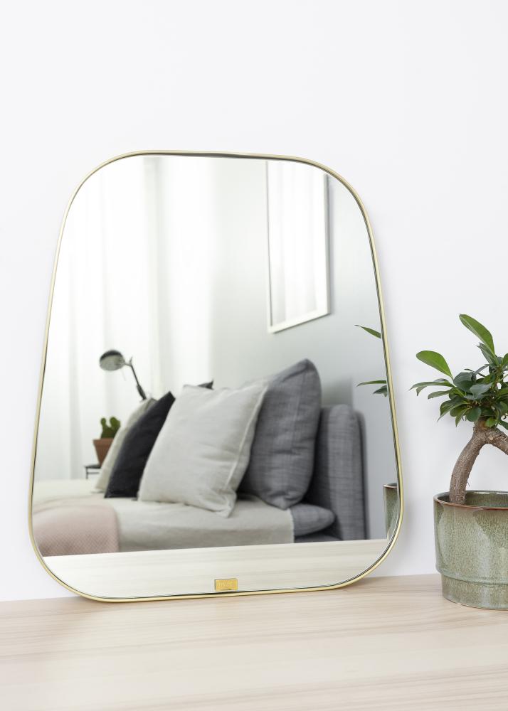 Seinäpeili joka erottuu muista! Luovan ja kauniin muodon ansiosta tämä peili on täydellinen sisustusesine moneen kotiin ja moneen huoneeseen. Peiliä kehystää ohut ja hillitty messinkikehys, mikä antaa sille tyylikkään korostuksen.