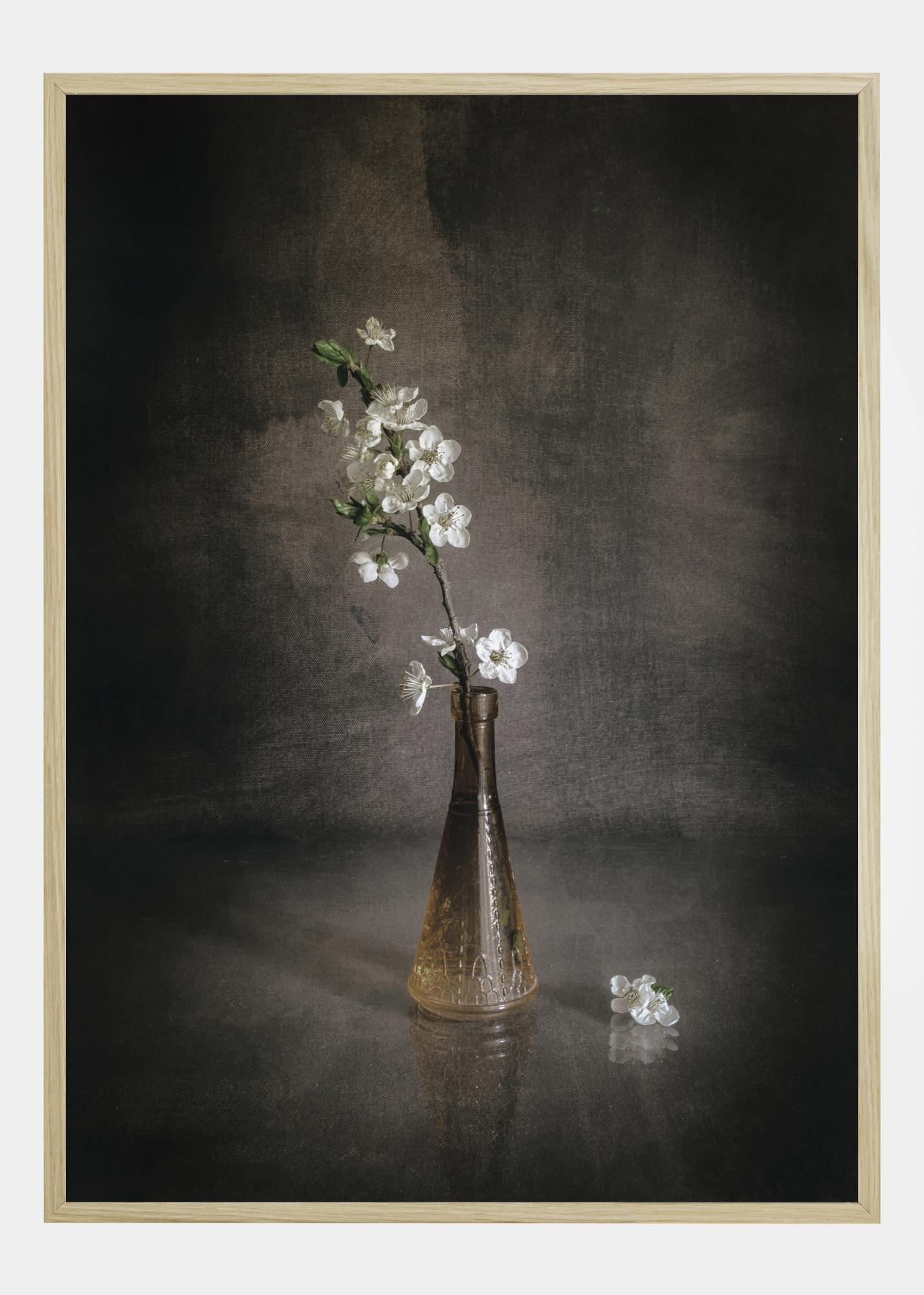 Keväinen juliste valkoisista kukista ohuessa ruskeassa maljakossa. Maljakko luo varjoja kahteen suuntaan ja samalla kirkkaan keskipisteen, jossa tähtimäiset kukat nousevat esiin takana olevan seinän tummanruskeaa leveää siveltimenjälkeä vasten. Pohdi tätä tyylikästä keväistä asetelmaa.