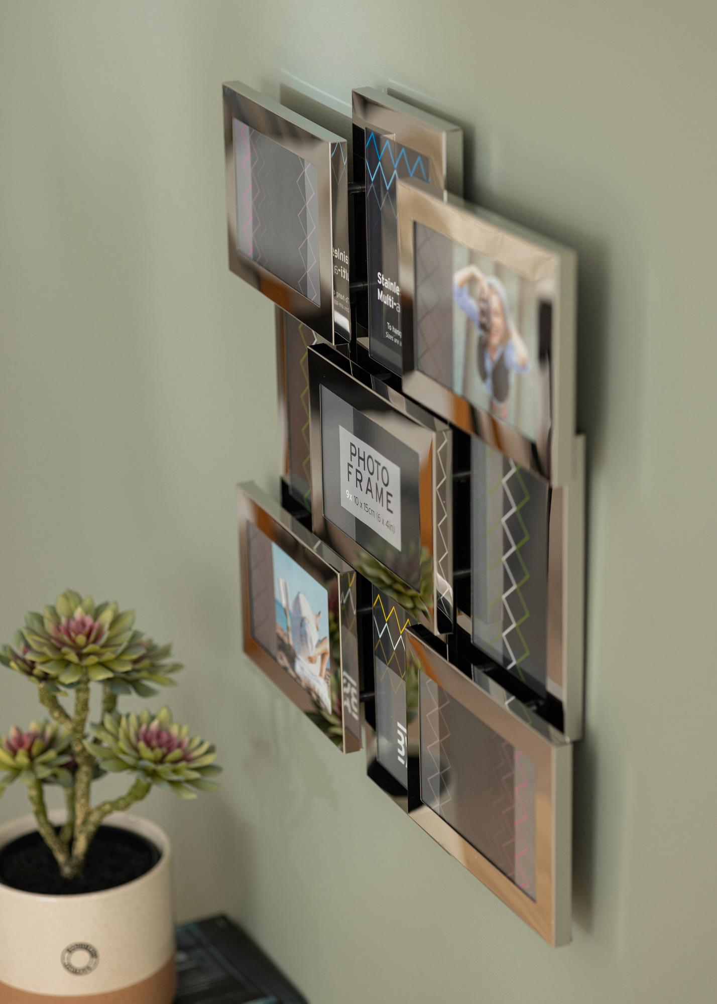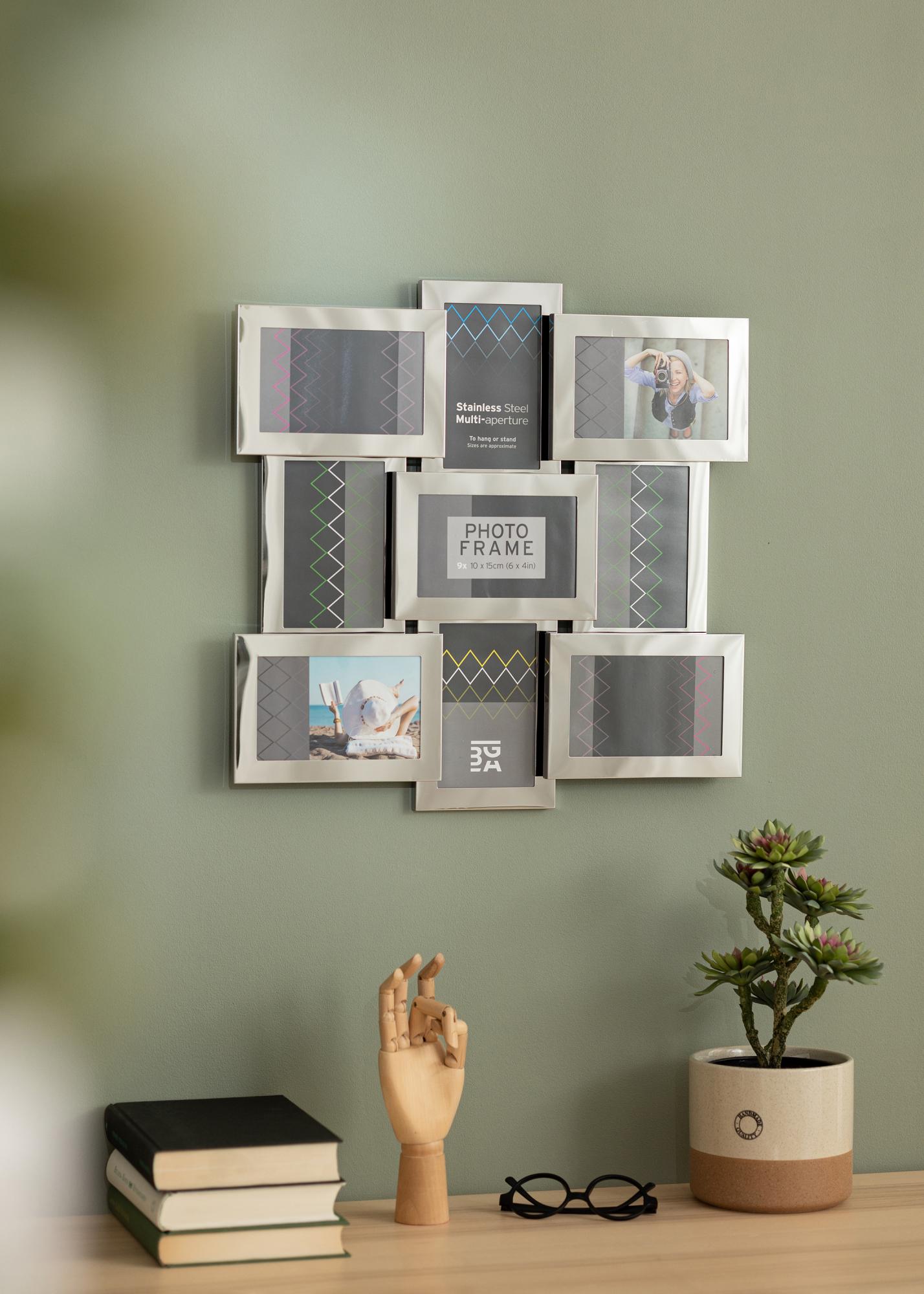 Metallinen hopeakehys tuo modernin vivahteen jokaiseen kotiin. Kehyksen materiaalissa on kiiltävä viimeistely, joka heijastaa kauniisti valoa lähellä olevista lampuista. Tähän kehykseen mahtuu sitä paitsi kokonaiset 9 kuvaa koossa 10x15 cm. Kehyksessä onkin siis hyvin tilaa perhe- ja lomakuville, sekä muille kuville, jotka haluat laittaa yhteen ja samaan kehykseen.