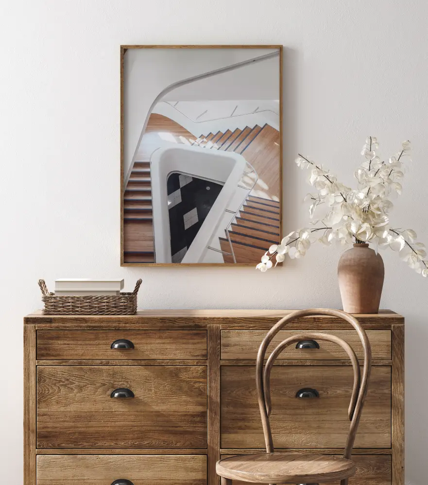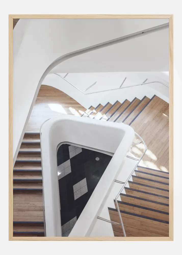 Sisustusjuliste, jossa on kolmion muotoon asetetut portaat. Portaat ovat ruskeat, seinät ja kaiteet valkoiset ja kaiteet kromatut. Ne kaartuvat alas ja kiertyvät alla olevaan mustavalkoiseen kaakelilattiaan. Katso ylhäältä alaspäin tässä Escher-tyyppisessä kuvassa ja kuvittele kulkevasi näitä kauniita portaita.