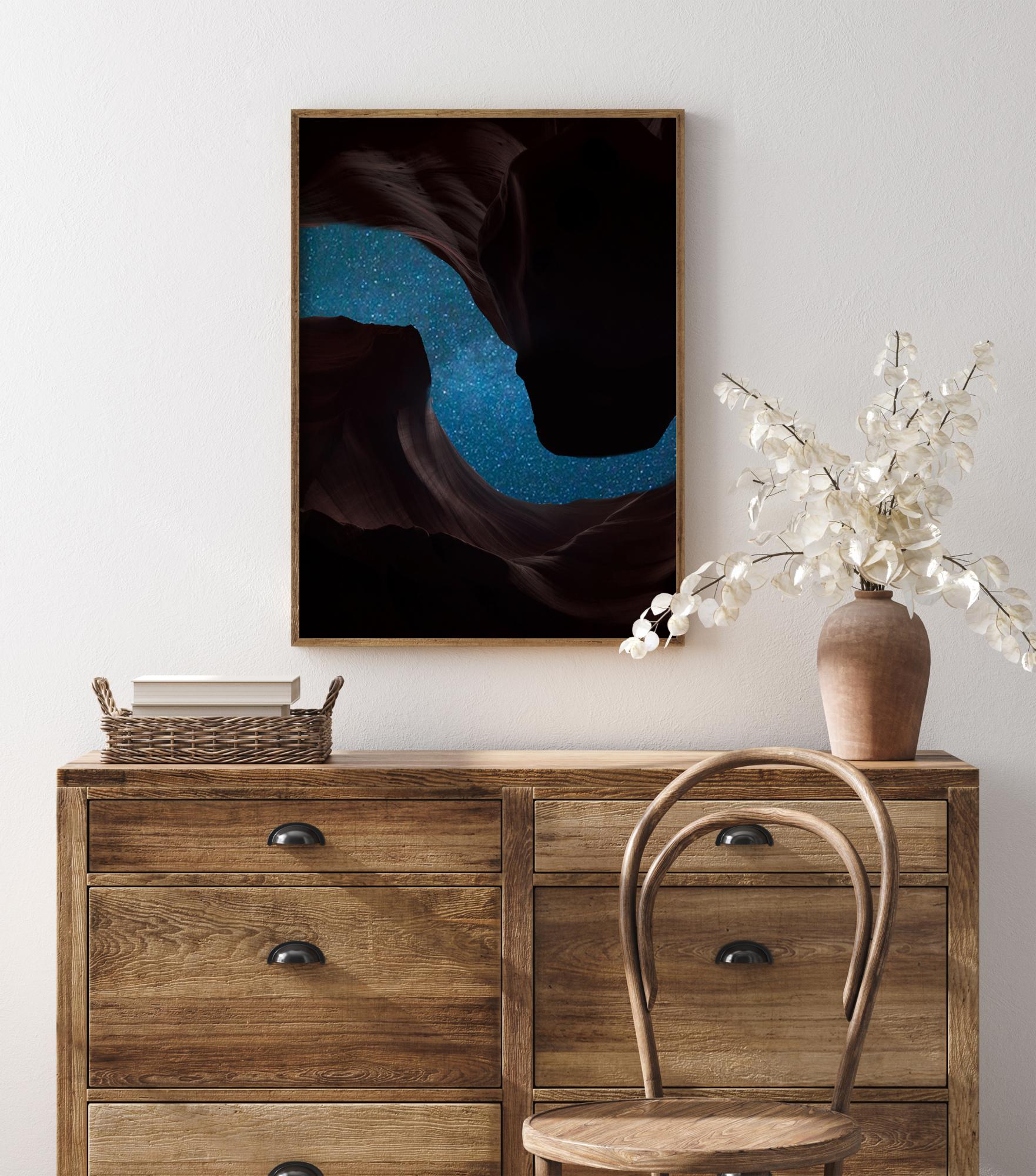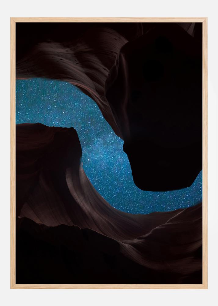 Upea yöjuliste, jossa tähtitaivas kurkistaa esiin dramaattisten kalliomuodostelmien välistä. Syvänpunaiset kalliot pyörivät tämän kuvan ylä- ja alapuolella ja luovat tähtimäisen polun, jonka läpi yötaivas loistaa tässä elävässä kuvassa, joka on suunniteltu herättämään kunnioitusta.