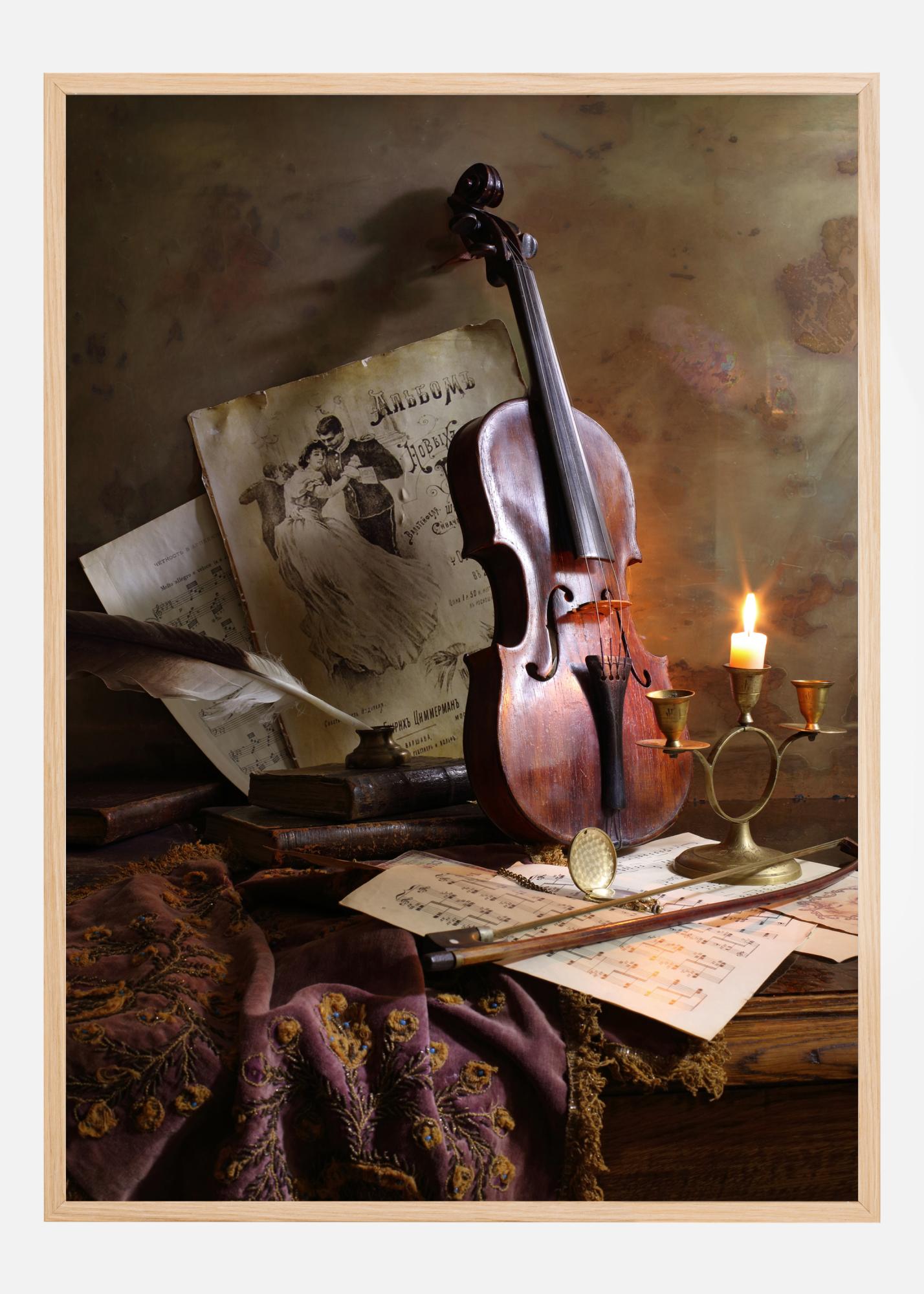 Asetelmajuliste viulusta ja nuottilevyistä. Pehmeä kynttilä palaa kirkkaasti valaisten viulun mahonginväristä väriä, kun se nojaa seinää vasten. Kangas, nuotinlehdet, sulkakynä, jousi ja muut tarvikkeet täyttävät näyttämön ja antavat huoneeseen lämpimän ja rikkaan tunnelman.
