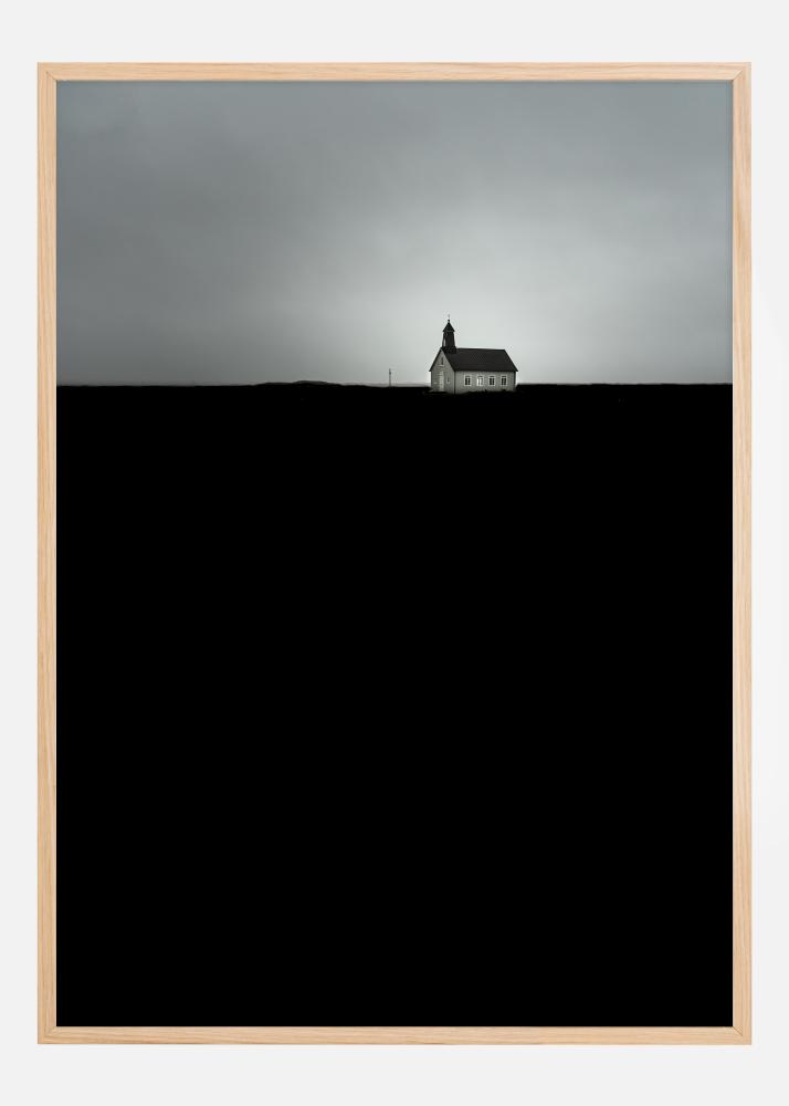Tämä juliste tarjoaa vahvan ja tunnelmallisen kuvan Strandarkirkjasta, yksinäisestä kirkosta, joka seisoo dramaattista taivasta vasten. Maiseman tumma siluetti luo jyrkän kontrastin harmaata taivasta vasten, mikä antaa tunteen eristyneisyydestä ja rauhallisuudesta. Kirkon valkoiset seinät loistavat maisemassa, tarjoten symbolin toivolle ja opastukselle ympäröivässä hämärässä.