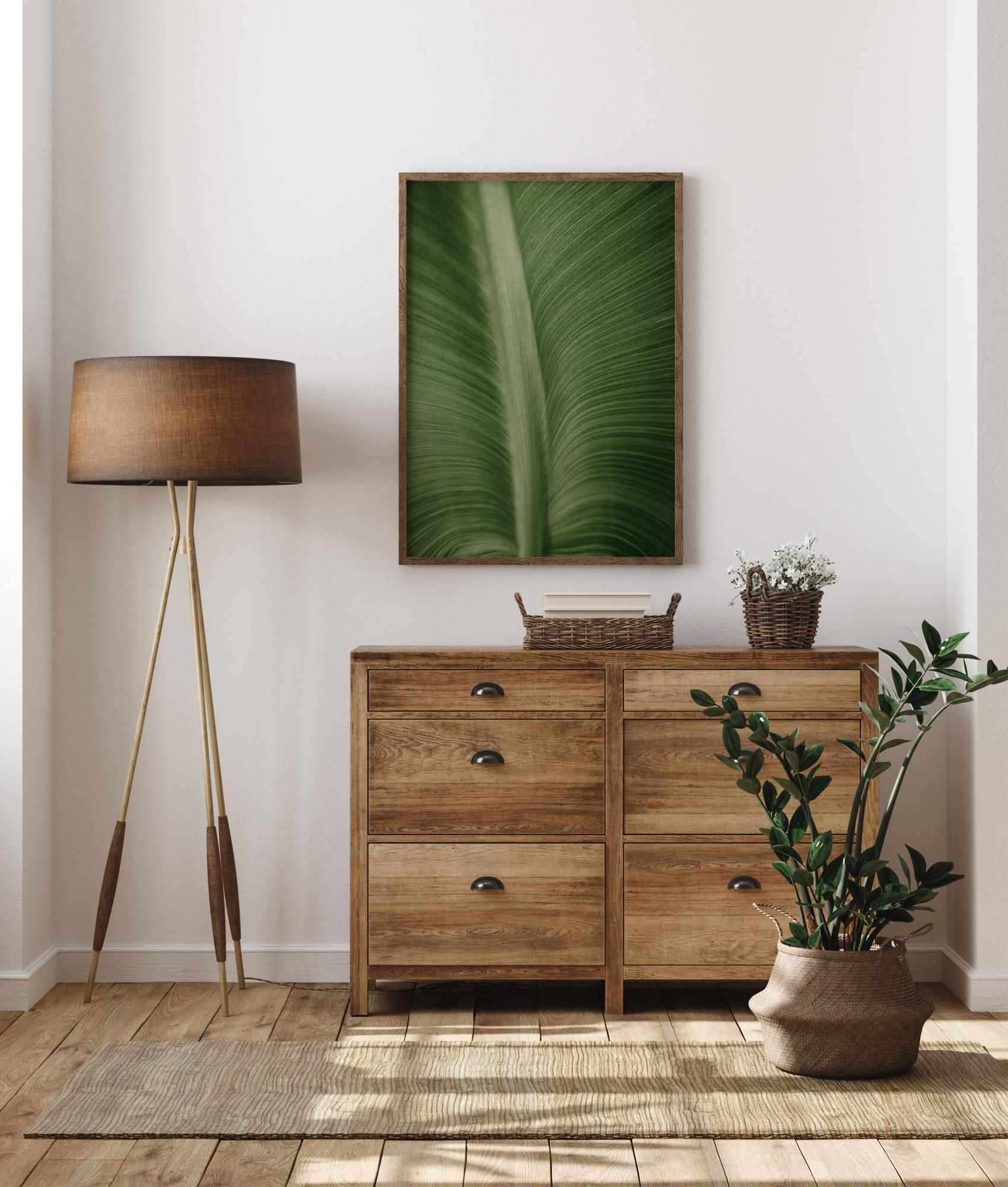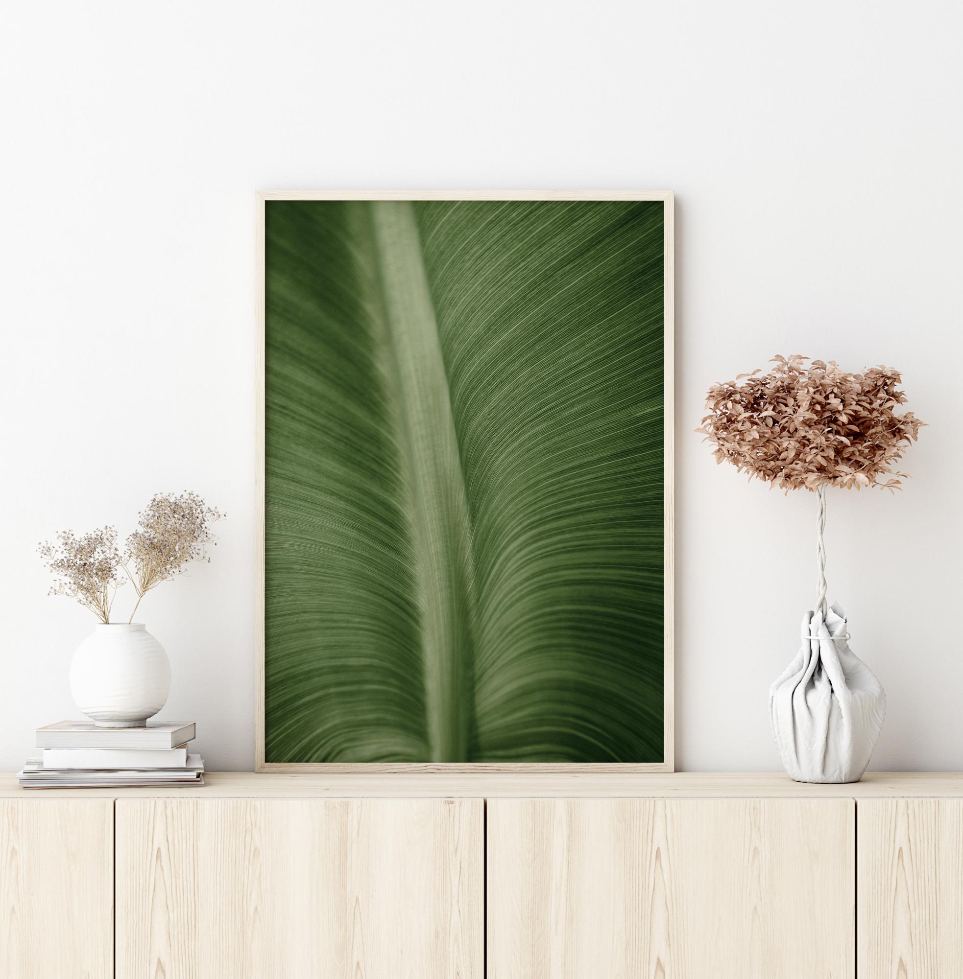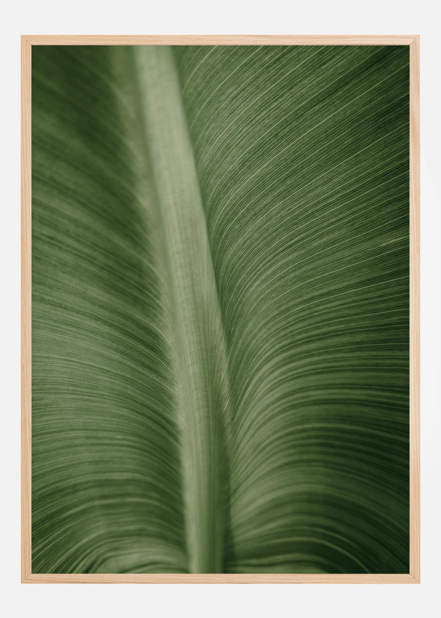 Makrojuliste lehdestä, jossa näkyy lehden syiden rakenne. Kauniit rehevät vihreät sävyt täyttävät tämän kuvan, mikä antaa erittäin rauhoittavan vaikutelman. Ohuet syyt kaartuvat kevyesti ulospäin lehden paksusta, vahvasta keskivarresta. Uppoudu luontoon tämän lähikuvan avulla.