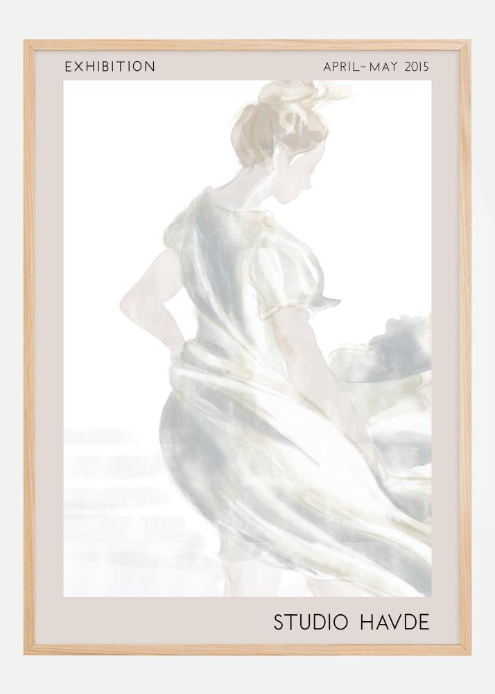 Tämä tyylikäs ja ilmava juliste Studio Havden huhtikuu-toukokuu 2015 -näyttelystä vangitsee keveyden ja liikkeen olemuksen. Kuva esittää naispuolista hahmoa, joka on maalattu pehmeillä, vesivärimäisillä siveltimenvedoilla ja näyttää liikkuvan sulavasti kankaan yli. Värit ovat hillittyjä ja harmonisia, vaaleansinisen, kermanvalkoisen ja kultaisen vivahteiden sävyissä, jotka yhdessä luovat ajattoman kauneuden ja eleganssin tunnelman.