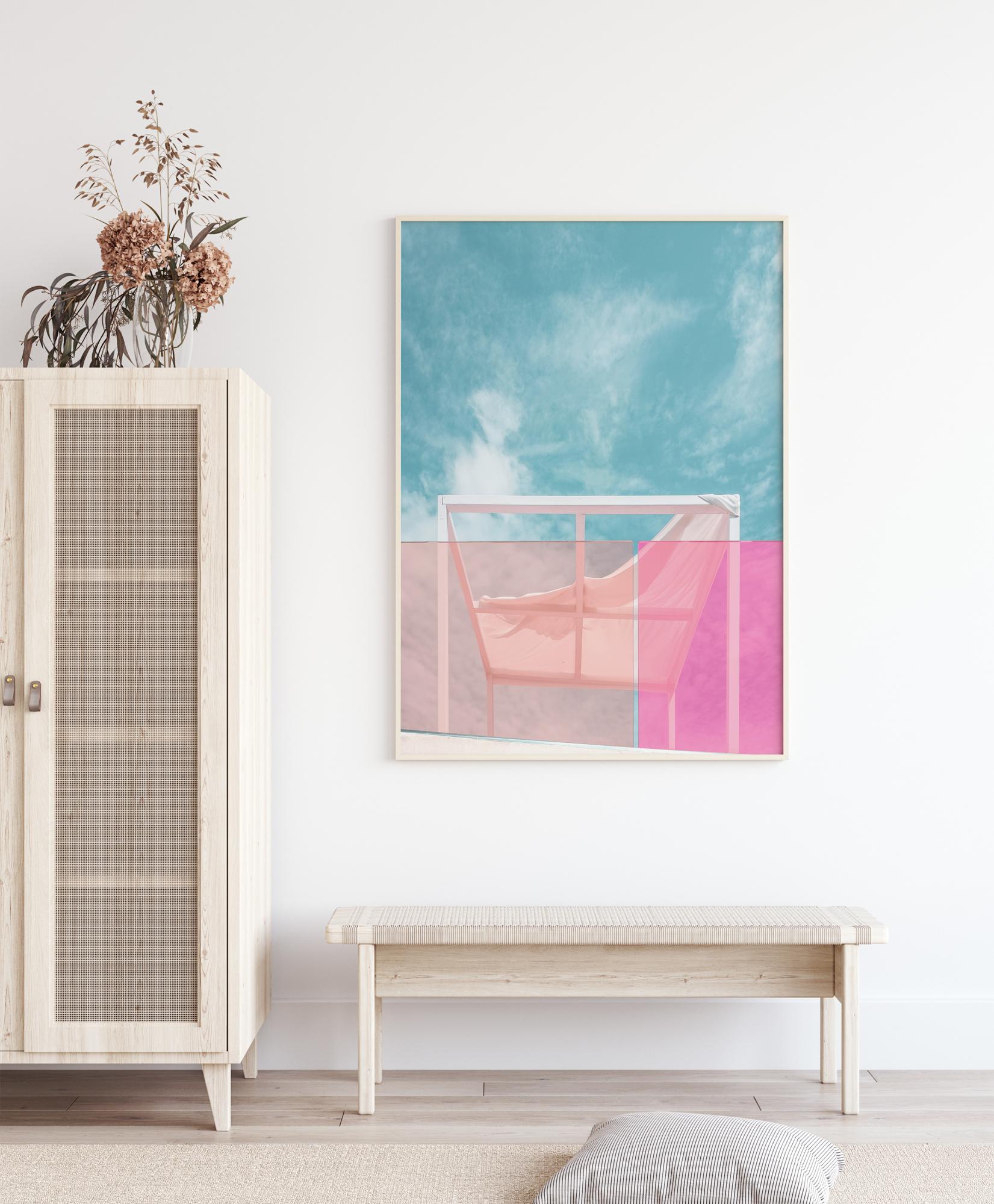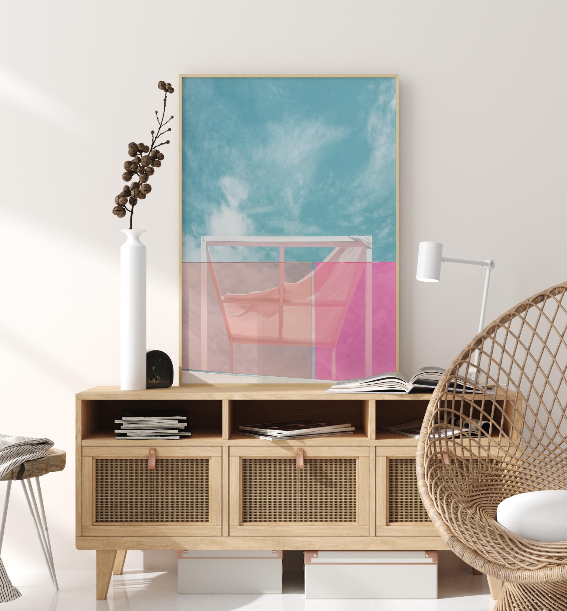 Värikäs juliste kesätaivaasta ja aurinkokatoksesta. Parvekkeen vaaleanpunaisten lasien läpi näkyy valkoinen katos ja pehmeät valkoiset pilvet sinisellä taivaalla. Kuvittele ottavasi aurinkoa täällä katolla lämpimänä kesäpäivänä.