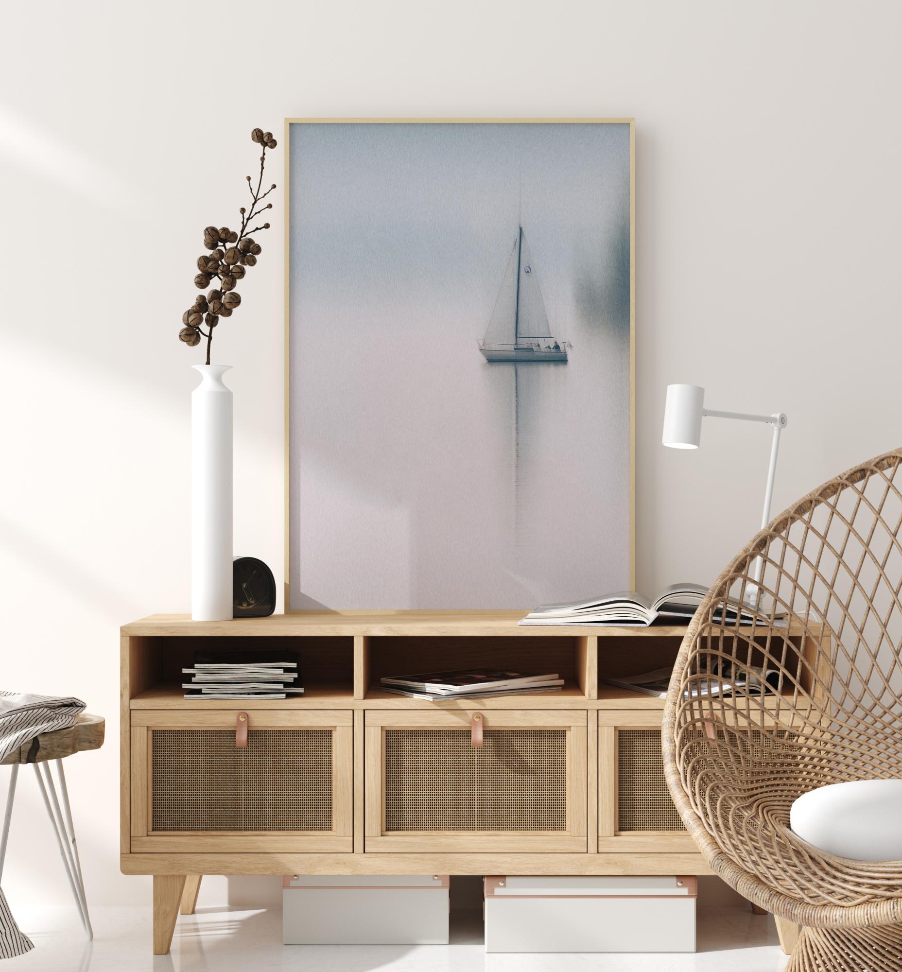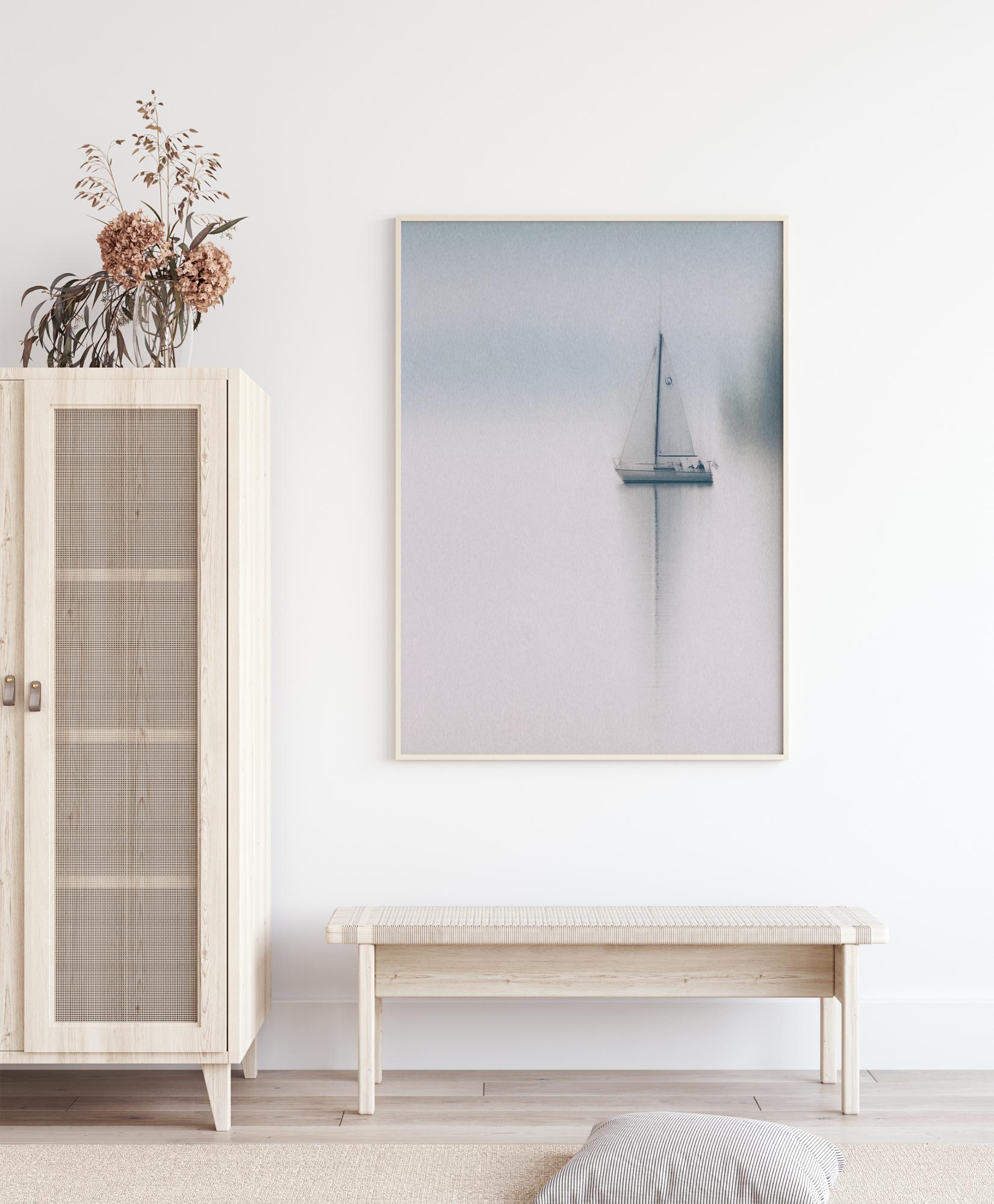 Rauhoittava juliste jahdista keskellä vaaleanvalkoista järveä. Kuva on pehmeä, ja reunat ovat sumeat. Veneen purje on pitkänomainen vedessä, kun se liukuu varhaisen sunnuntaiaamun vaaleansinisen ja harmaan sumussa.