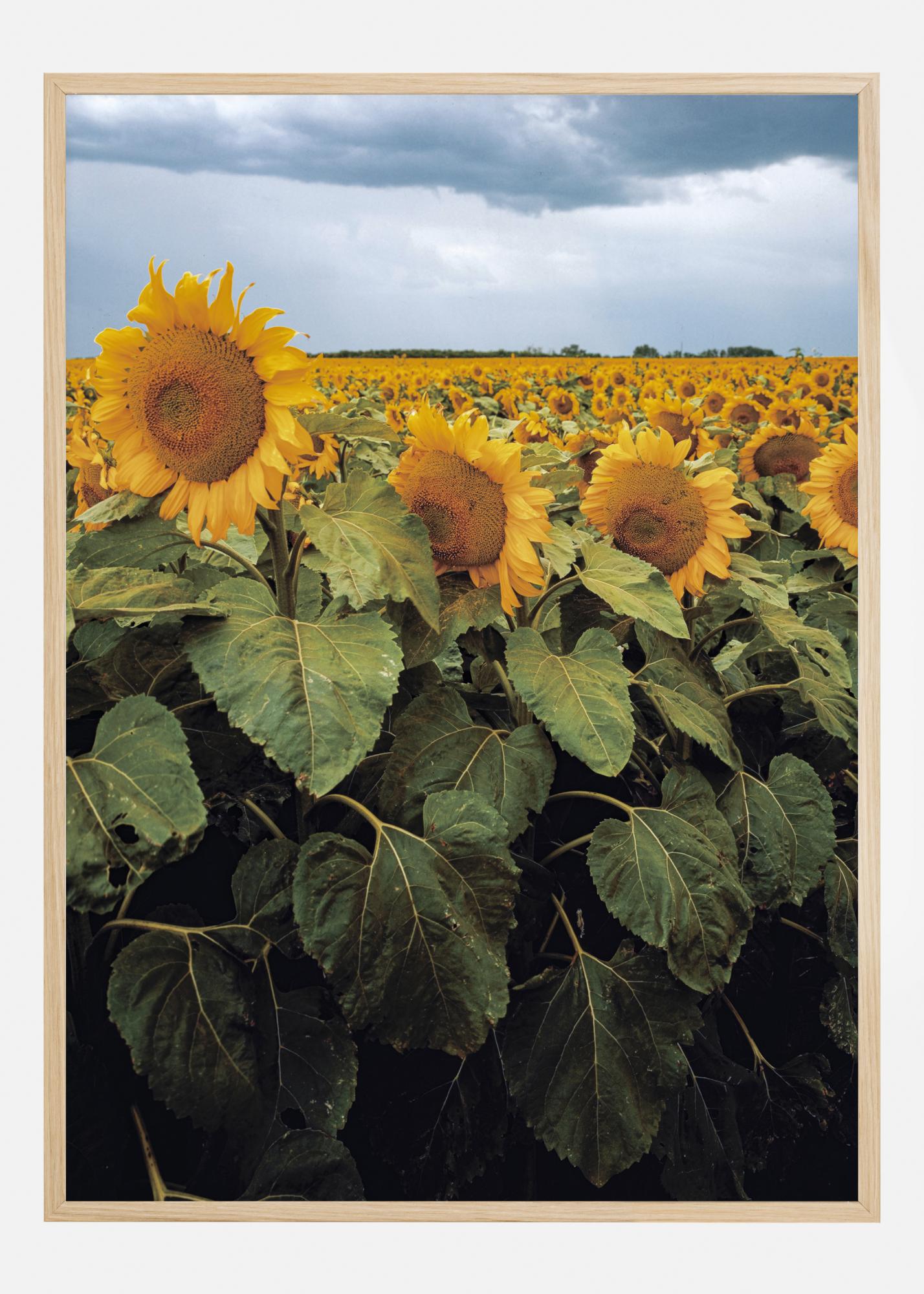 Häikäisevä juliste laajasta auringonkukkapellosta. Kuvan täyttävät kukkien pitkät vihreät varret ja lehdet. Päällimmäisenä leijuu kirkkaan keltaisten auringonkukkien meri, joka ulottuu kauas kohti sinistä taivasta. Tunne olosi pirteäksi tämän iloisen tulosteen avulla.