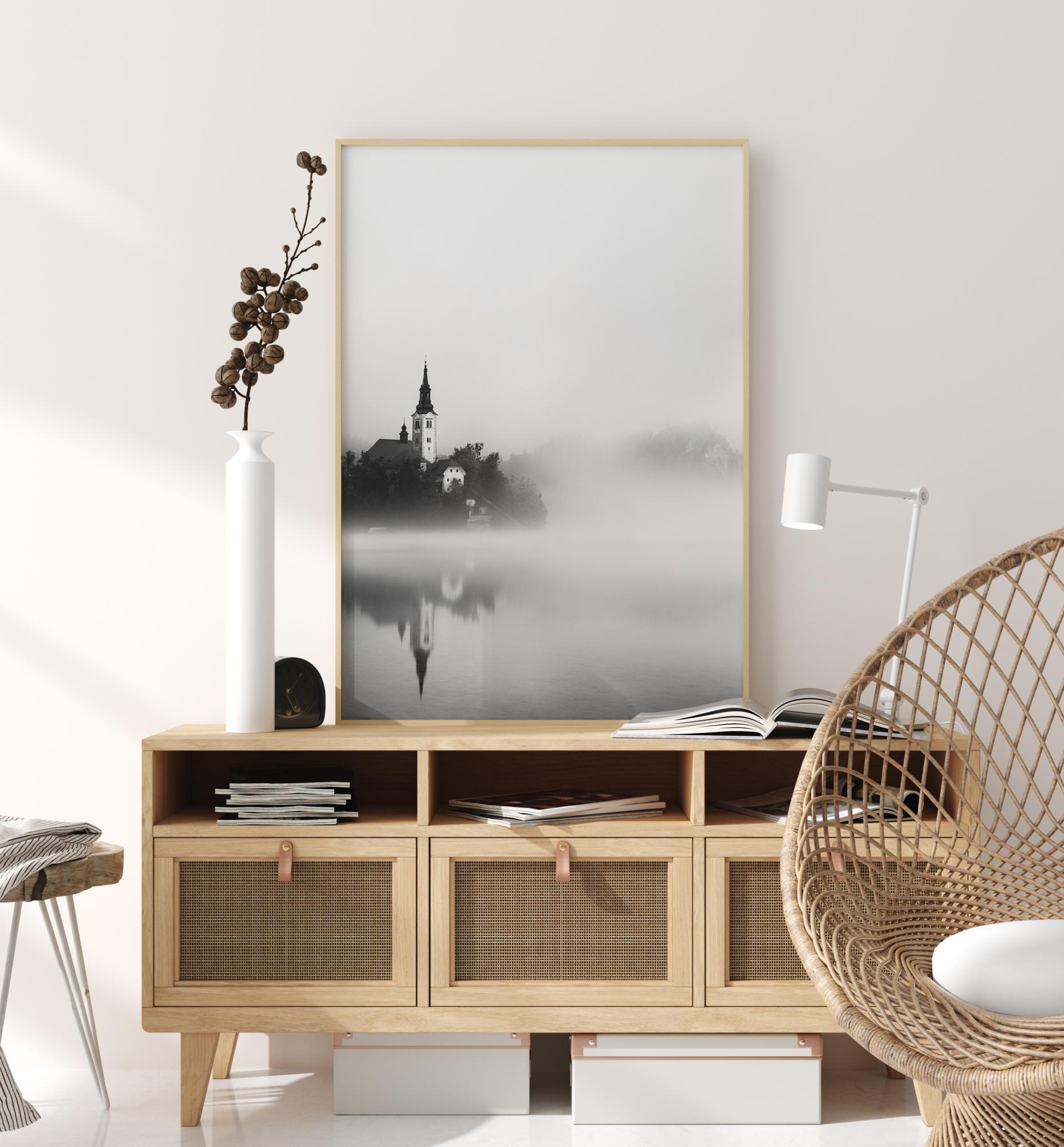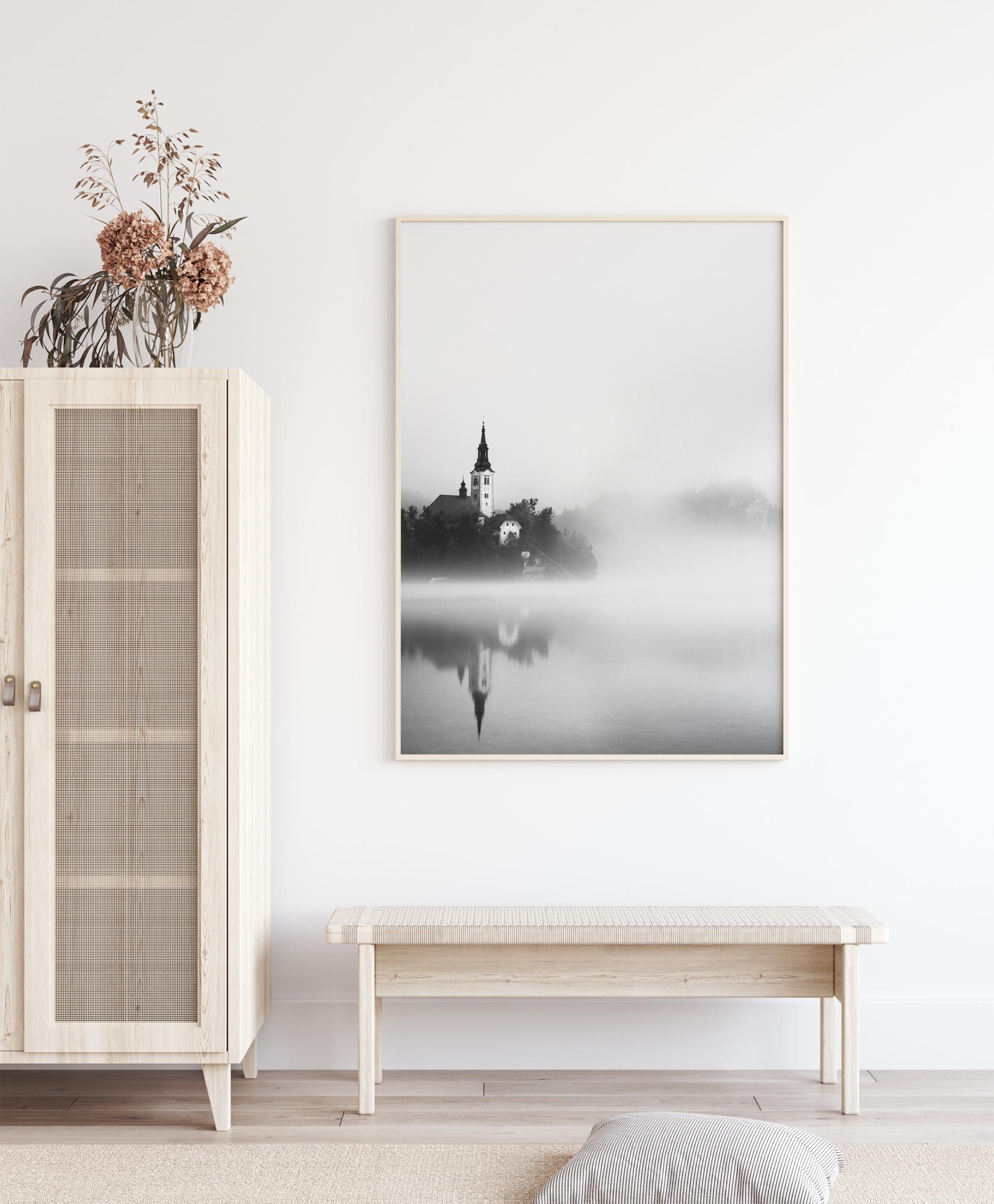 Uskonnollinen juliste valkoisesta kirkosta järven vieressä. Tässä mustavalkoisessa valokuvassa on salaperäisyyttä. Järvi on sumun peitossa auringon noustessa. Kirkko ilmestyy sumusta, ja sen terävät linjat ovat ristiriidassa sumun pehmeyden kanssa.