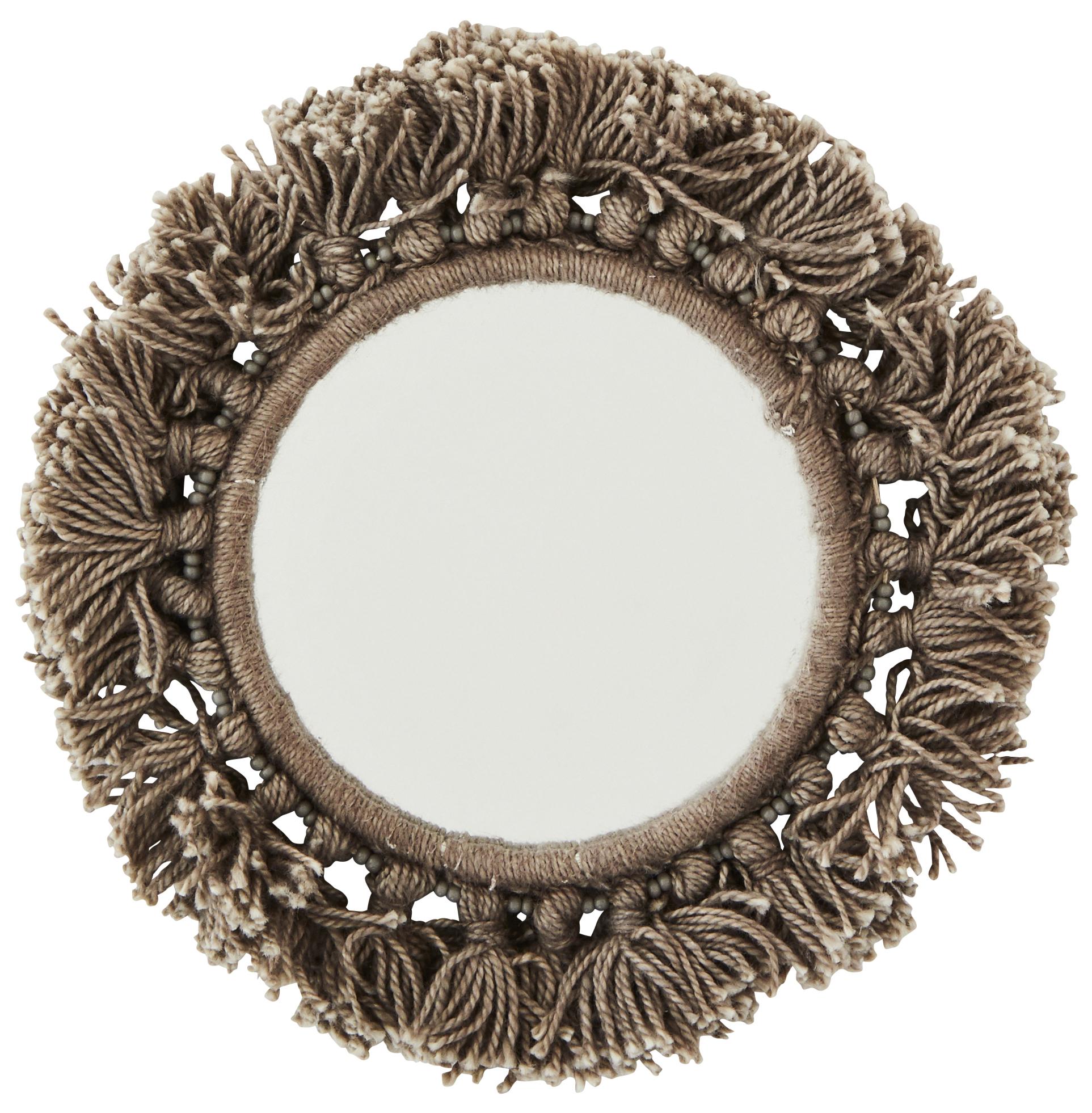 Tämä Madam Stoltzin taskupeili on sekä käytännöllinen että täynnä luonnetta. Sen kompaktin koon ansiosta - halkaisija on vain 11 cm - se on todella helppo laittaa laukkuun tai takin taskuun. Peili on valmistettu lasista ja puuvillasta ja viimeistelty koristeellisilla tupsuilla, jotka koristavat reunoja. Sitä on saatavilla eri väreissä, joista tämä on luonnonläheisen harmaa.