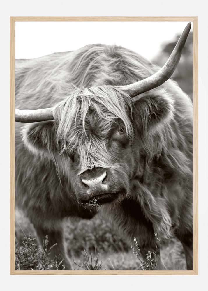 Villieläinjuliste ylänköhärkälehmän sonnista. Sonni nojaa kehykseen turkki silmiensä päällä roikkuen. Yksi silmä tuijottaa kameraan, ja sen pehmeä, pörröinen turkki vangitsee valoa sen liikkuessa. Sarvista huolimatta lehmän kasvot ovat pehmeät ja ihastuttavat, voit melkein tuntea sen märän nenän.