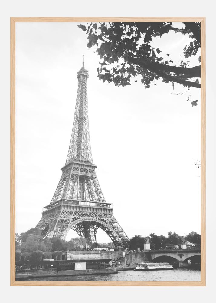 Maamerkkijuliste Eiffel-tornista Pariisissa. Harmaa torni erottuu selvästi valkoista taivasta vasten. Sen alapuolella näkyy joen vilske veneineen ja siltoineen. Puun oksa lähes peittää tornin huipun tässä yksinkertaisessa, luonnollisessa otoksessa tästä ikonisesta monumentista.