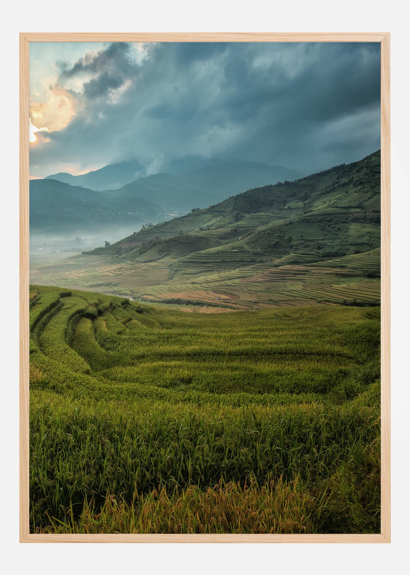 Upea maisemajuliste kirkkaanvihreistä kukkuloista ja pelloista. Tummat pilvet vyöryvät oikealta ja peittävät yhden kaukaisista vuorista. Ripaus oranssia aurinkoa näkyy, mikä luo lämpimämmän sävyn tähän eeppiseen kuvaan. Saat avaruuden tunteen kotiisi tämän julisteen avulla.