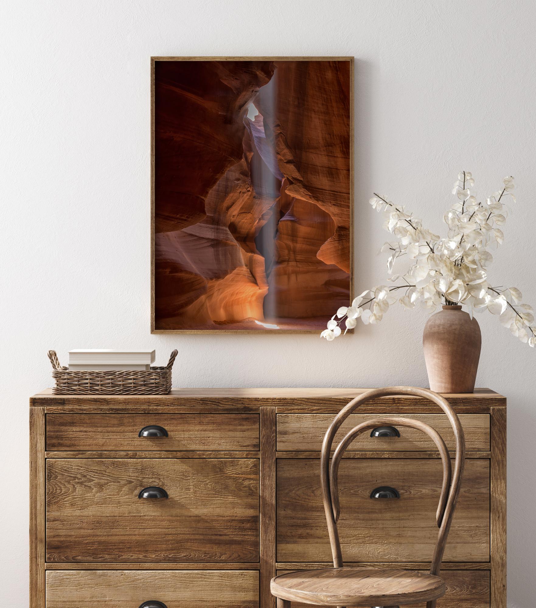 Maaginen juliste punaisen kallion läpi kulkevasta valonsäteestä. Punaisten kallioiden pehmeät kaaret luovat lämpimän hehkun. Yksittäinen valonsäde lisää maagista tunnelmaa tähän suljettuun tilaan ja valaisee pehmeät kalliot entisestään. Tuo tämä teos dramaattisena lisänä kotiin.