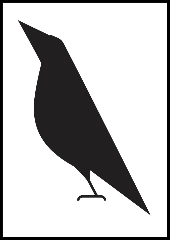 Graafinen printtikuva, jossa on tyylikäs luonnos korppilinnusta nokka pystyssä. Linnun yksinkertainen musta muoto valkoista taustaa vasten tekee julisteesta sopivan kaikkiin tiloihin ja sisustuksiin aina lastenhuoneesta hammaslääkärinvastaanoton odotushuoneeseen. Posteri pääsee oikeuksiinsa kehystettynä yksivärisiin kehyksiin tai julisteripustimiin, mielellään yhdessä muiden mustavalkoisten kuvien ja graafisten julisteiden kanssa luomaan mielenkiintoinen tauluseinä.