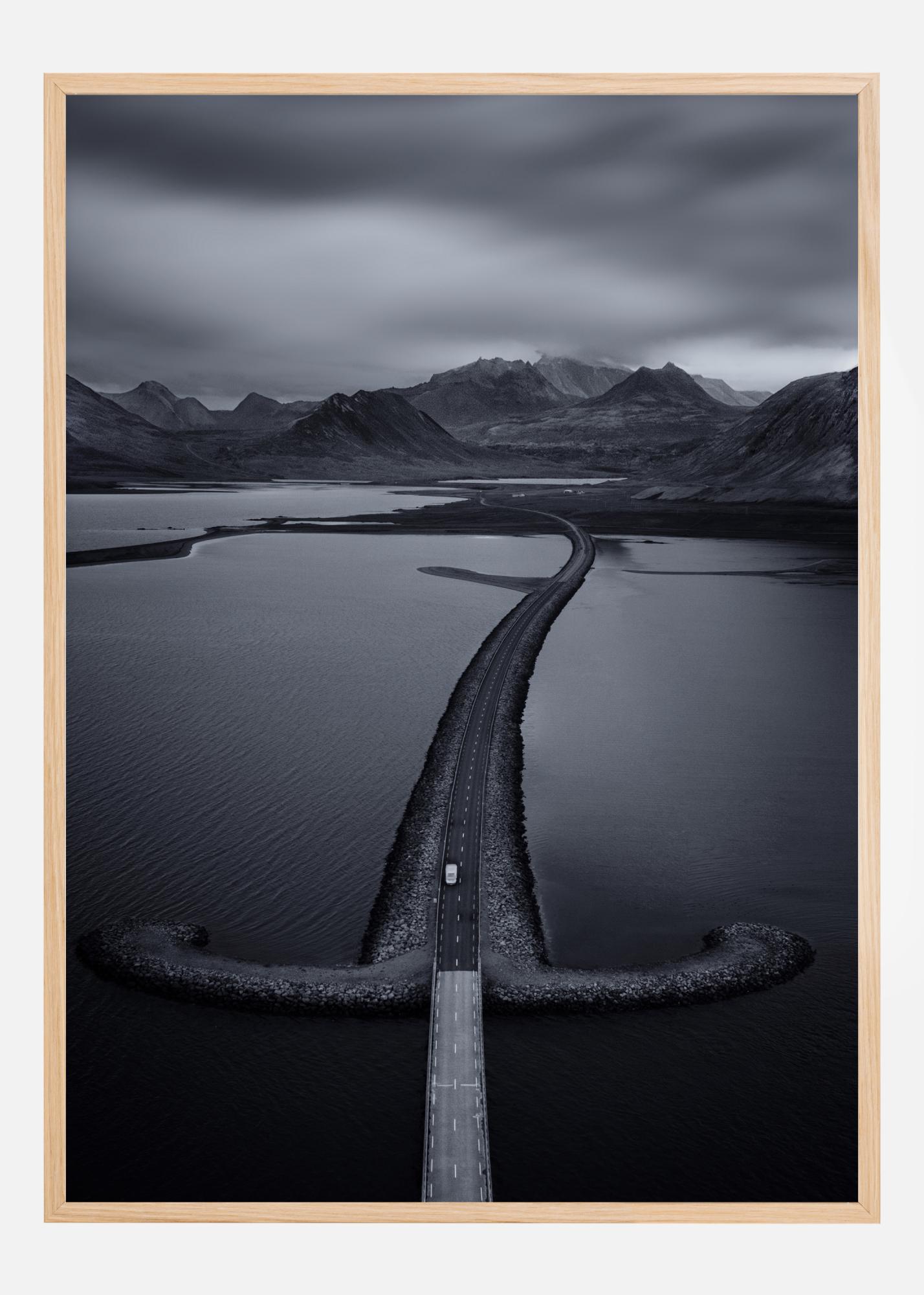 Harmaasävyinen juliste leveästä tiestä, joka kulkee järvien halki ja niiden takana oleville vuorille. Harmaa pilvinen taivas roikkuu niiden yläpuolella. Yksittäinen valkoinen auto kulkee tietä kaukaisuuteen. Yhdistä kirkkaan seinän kanssa, jotta saat tähän ankaraan kuvaan lisää väriä.