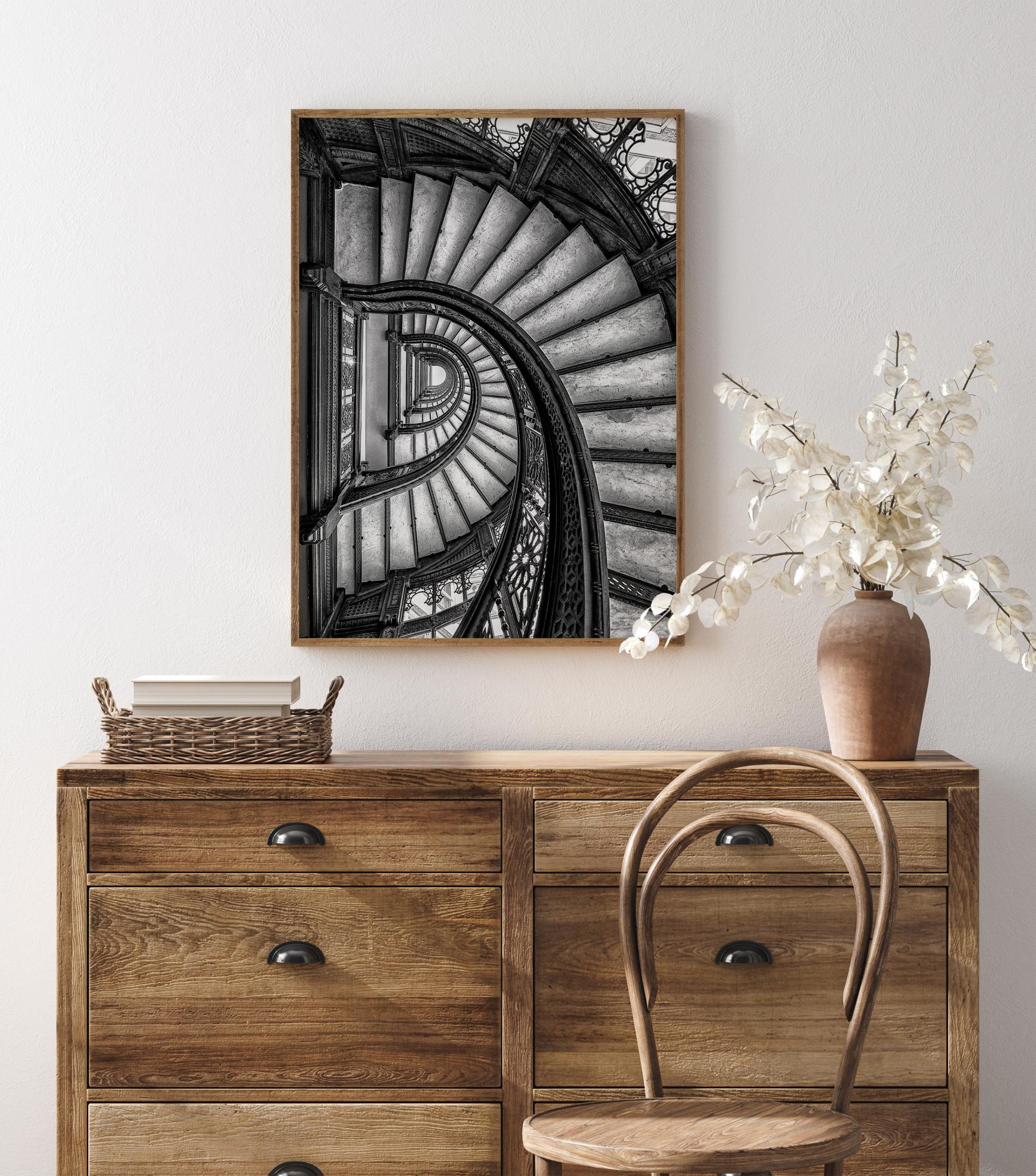 Sisustusjuliste, jossa kierreportaat kiemurtelevat alas rakennuksen pohjaan. Ylhäältä katsottuna portaat pyörivät poispäin. Takorautaiset kaiteet ovat monimutkaisesti yksityiskohtaiset, ja ne erottuvat yksinkertaisista portaista. Vastakkaiset sävyt antavat julisteelle syvyyttä, kun katseet imeytyvät alaspäin.