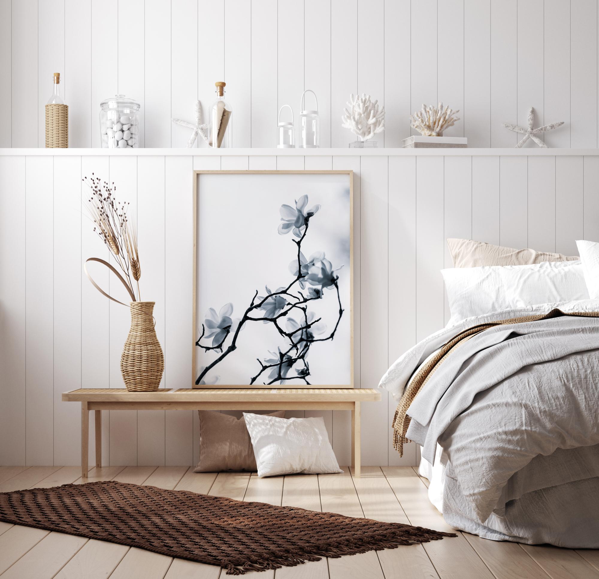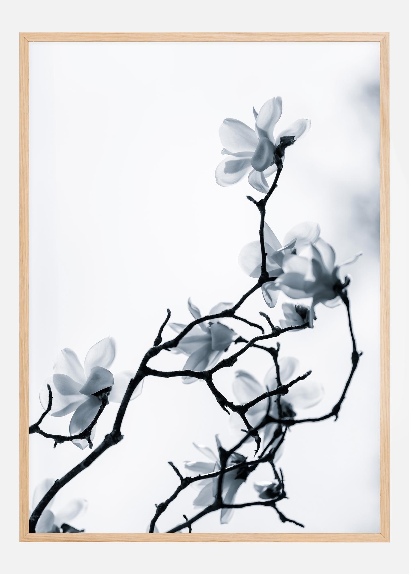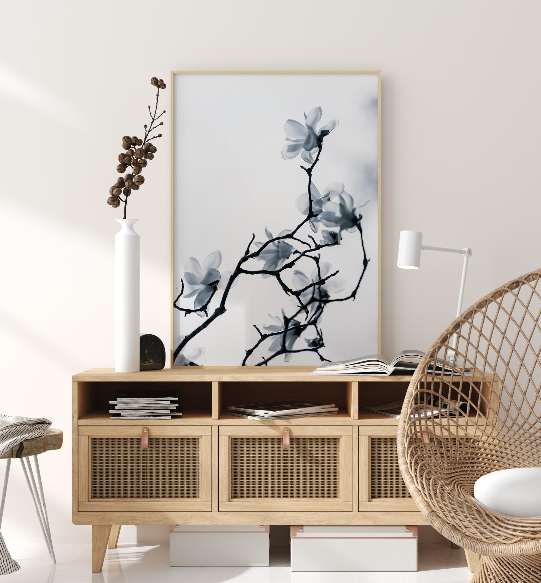 Kukkajuliste herkästä oksasta, joka on täynnä pehmeitä kukkia. Musta oksa valkoista taivasta vasten ja ohuet oksat kurottavat ylöspäin. Jokainen oksa pitää pehmeää valkoista kukkaa. Tästä kuvasta huokuu tyyneys ja rauhallisuus, ja se sopii hyvin kylpyhuoneen tai tavallisen eteisen seinälle.